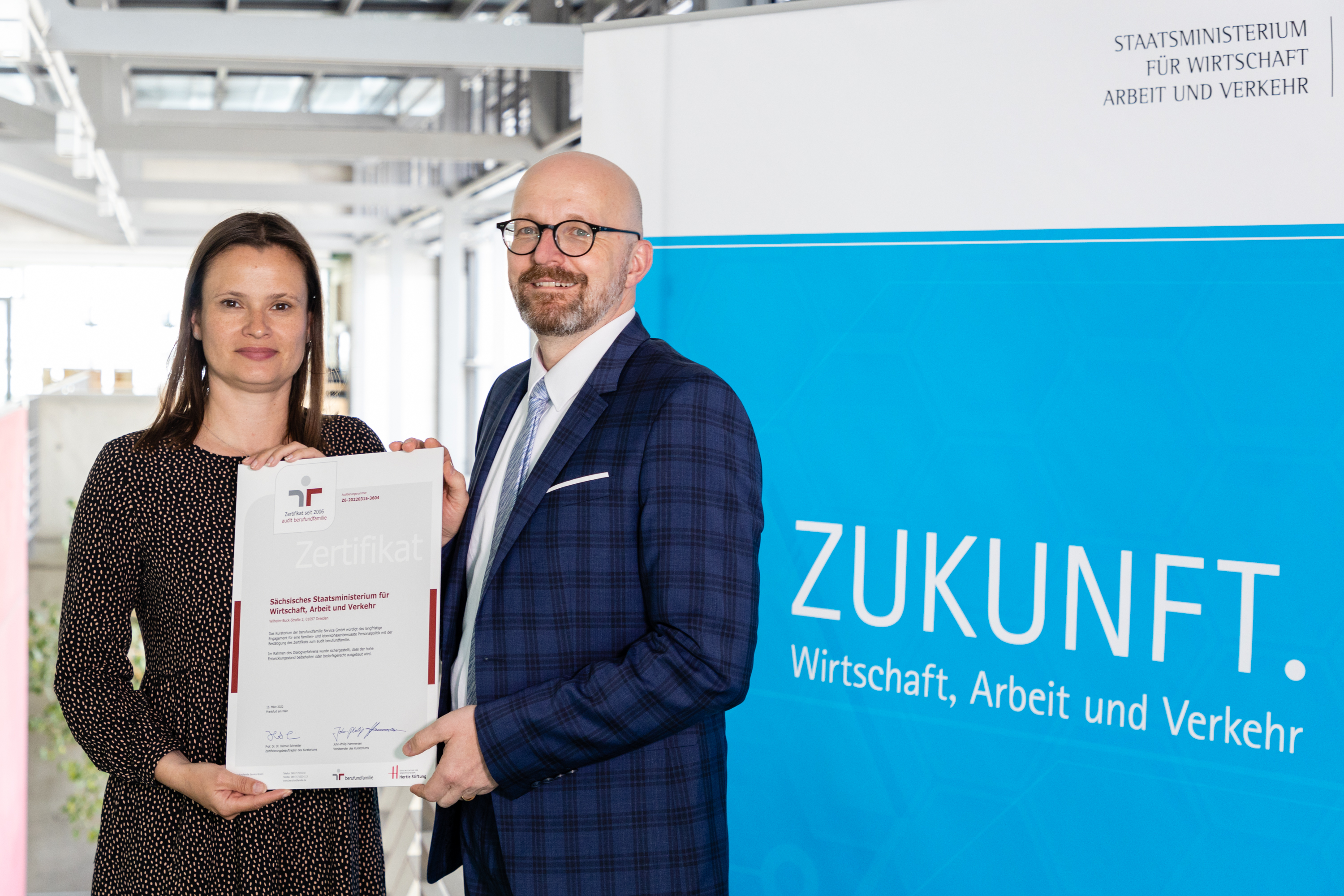Wirtschaftsstaatssekretär und SMWA-Amtschef Thomas Kralinski mit Kerstin Schütze aus der Projektgruppe "Vereinbarkeit von Familie und Beruf" im SMWA