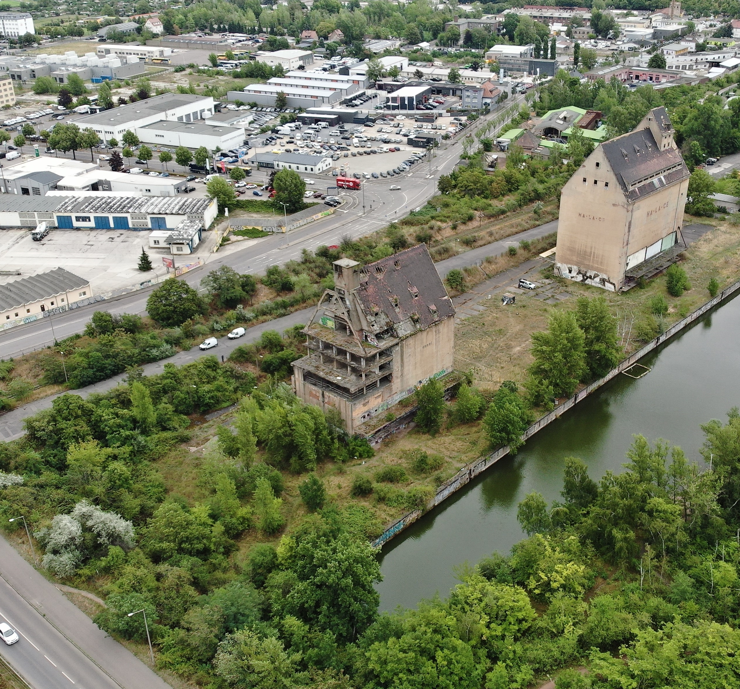 Foto: Luftaufnahme des Speichergebäudes im Leipziger Lindenauer Hafen