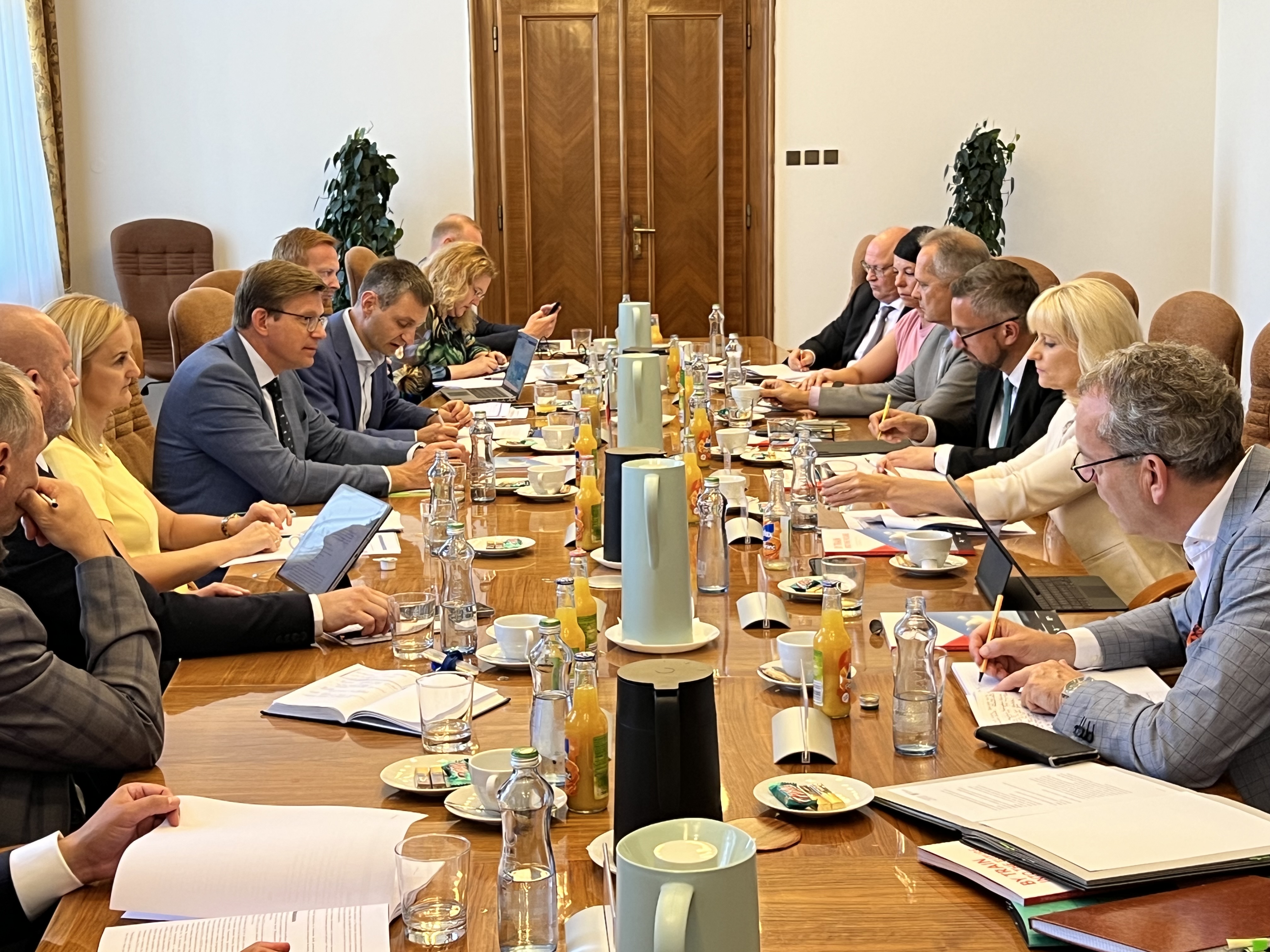 Das Bild zeigt die Teilnehmerinnen und Teilnehmer des deutsch-tschechischen Arbeitsgespräches während der gemeinsamen Besprechung.