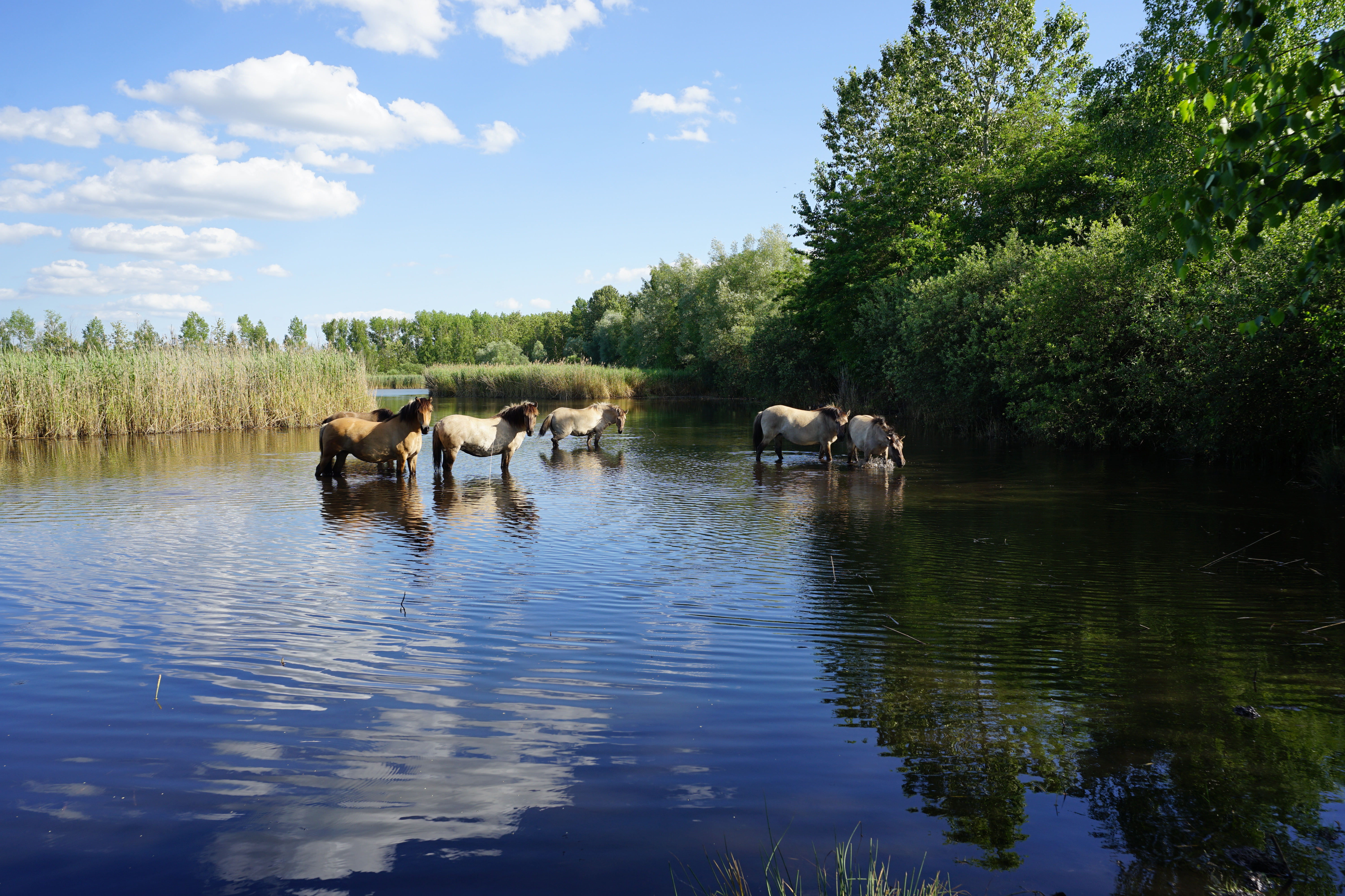 Konik-Pferde in einem Gewässer in der Bergbaufolgelandschaft