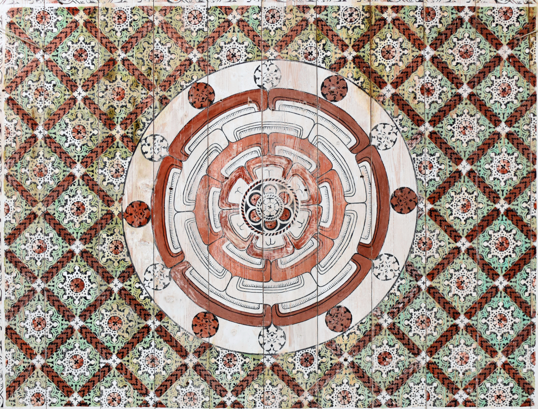 Hartmannsdorf-Reichenau, Laurentiuskirche, Decke mit Schablonenmalerei, Ausschnitt, 2023