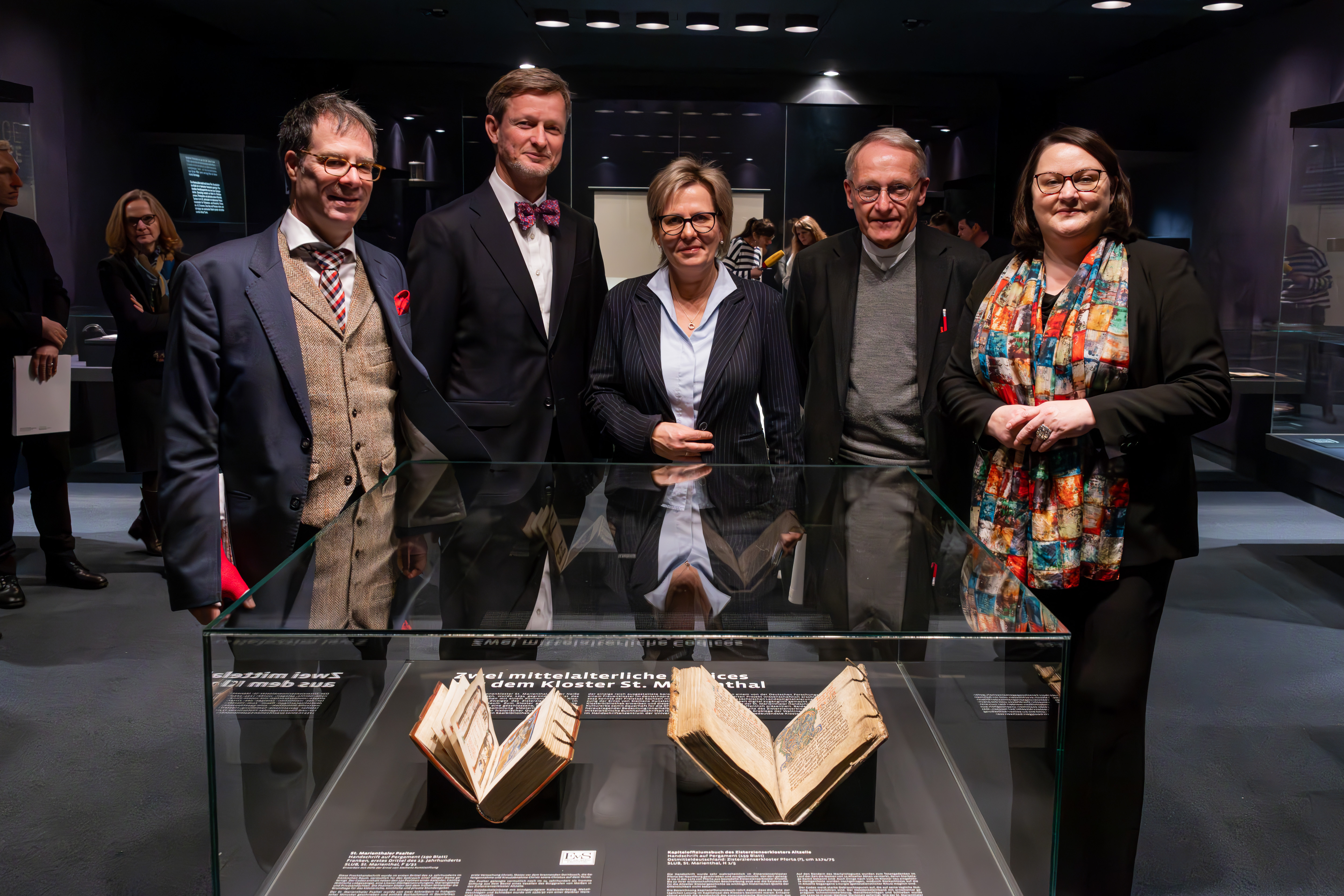 Dr. Martin Hoernes, Dr. Andreas Handschuh, Barbara Klepsch, Prof. Marc-Aeilko Aris und Katrin Stump (v.l.n.r.) bei der Präsentation der beiden Spitzenstücke (Psalter und Kapiteloffiziumsbuch), Foto: Ben Gierig