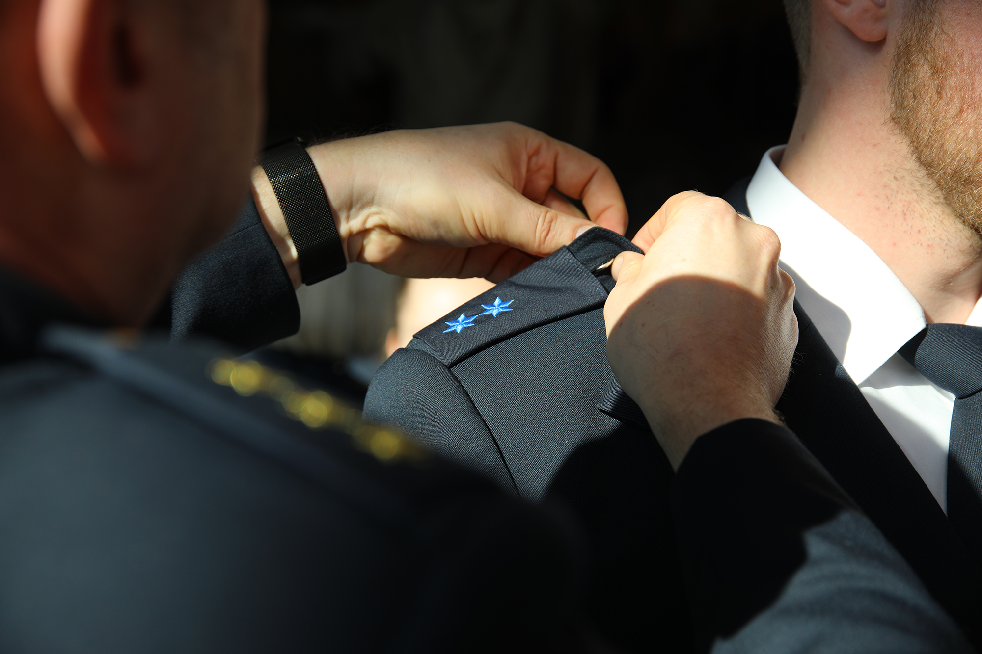 Symbolbild - Ein Auszubildender der Polizei Sachsen wird mit bestandener Ausbildung zum Polizeimeister ernannt und erhält seine neuen Dienstgradschlaufen.