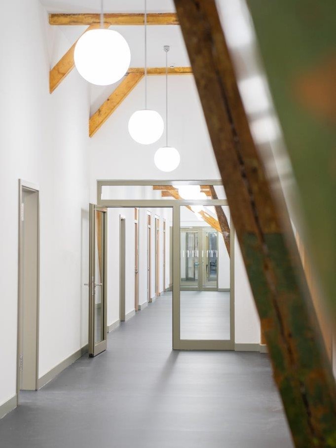 Innenansicht Gebäude Sächsischer Rechnungshof mit sanierten Holzbalken