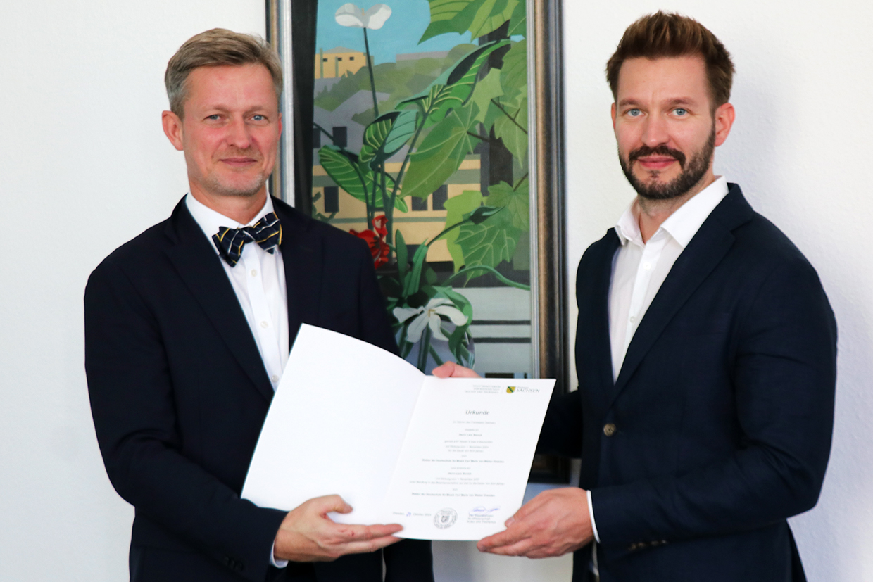 Wissenschaftsstaatssekretär Dr. Andreas Handschuh (links) überreicht dem neuen Rektor der Hochschule für Musik Dresden, Lars Seniuk, die Dokumente zu seiner Ernnennung. Beide halten die Dokumentenmappe vor sich und lächeln. Im Hintergund ist ein Bild an der Wand zu sehen.