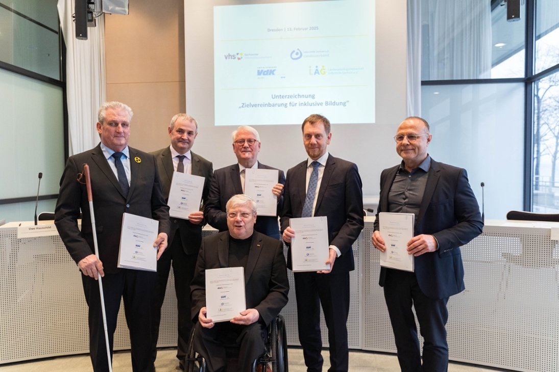 Unterzeichnung der Zielvereinbarung für inklusive Bildung. V.l.n.r. Uwe Hauschild (Landesarbeitsgemeinschaft Selbsthilfe Sachsen), Michael Welsch (Landesbeauftragter für Inklusion der Menschen mit Behinderungen im Freistaat Sachsen), Horst Wehner (Sozialverband VdK Sachsen e. V.), Bernd Wiesner, (Landesverband Lebenshilfe Sachsen e. V.), Michael Kretschmer (in seiner Funktion als Präsident des Sächsischen Volkshochschulverbands e. V.), Dr. Ralph Egler (Sächsischer Volkshochschulverband e. V.).