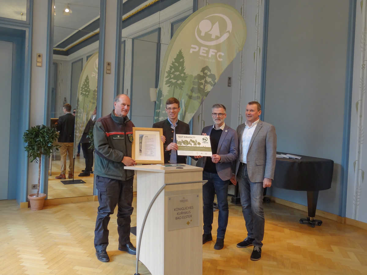 Übergabe des PEFC-Zertifikats „Erholungs-, Kur- und Heilwald“; v.l.n.r.: Utz Hempfling (Landesforstpräsident), Maximilian Fottner (Auditor HW Zert), Olaf Schlott (Bürgermeister Stadt Bad Elster), Jens Böhmer (Sächsische Staatsbäder GmbH) (© M. Creutz, Sachsenforst)
