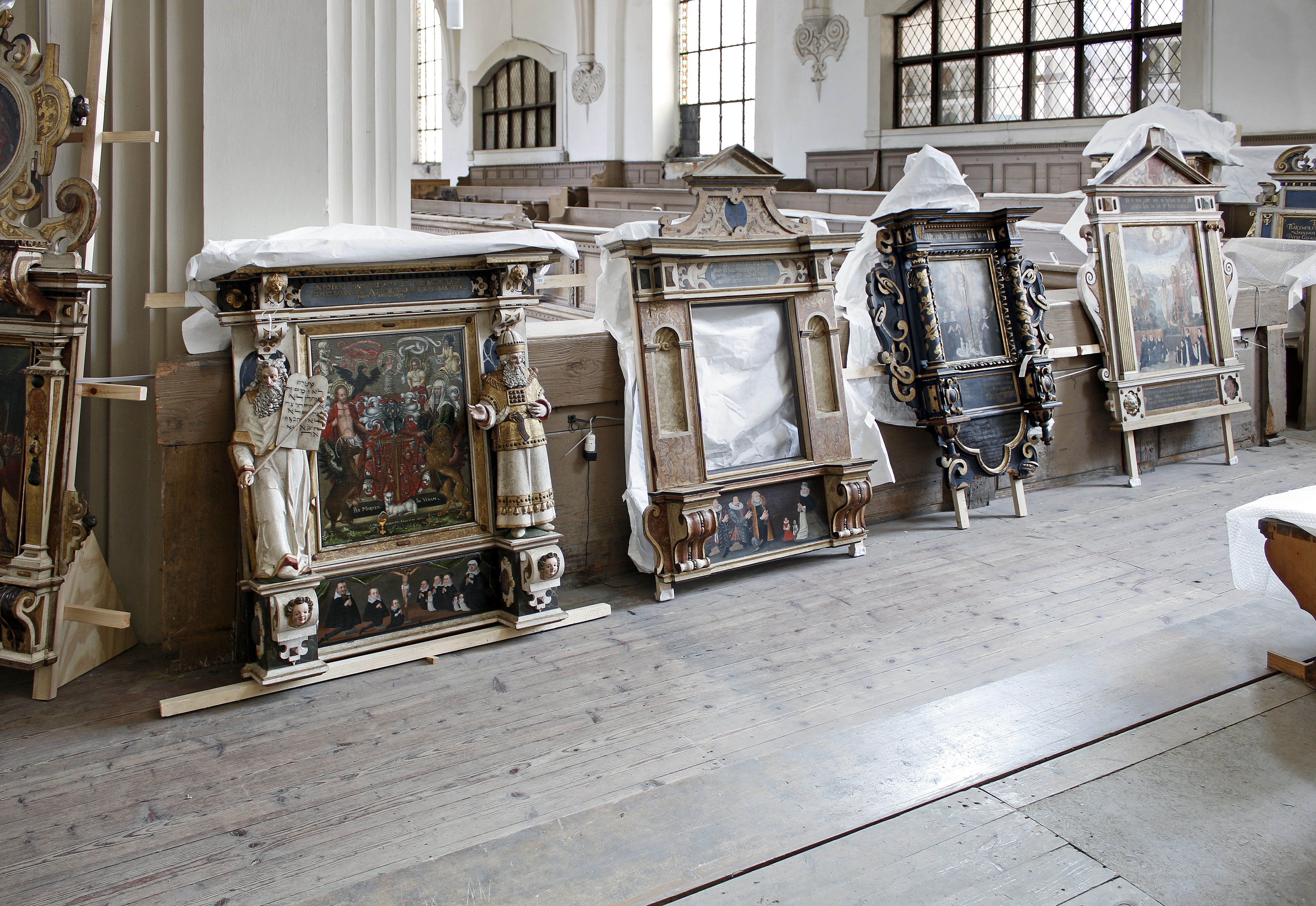 Zittau, Epitaphienschatz, einige der im Rahmen des »Epitaphienprojekts« restaurierten Epitaphe auf der Empore der Klosterkirche (© David Nuglisch, Dresden)