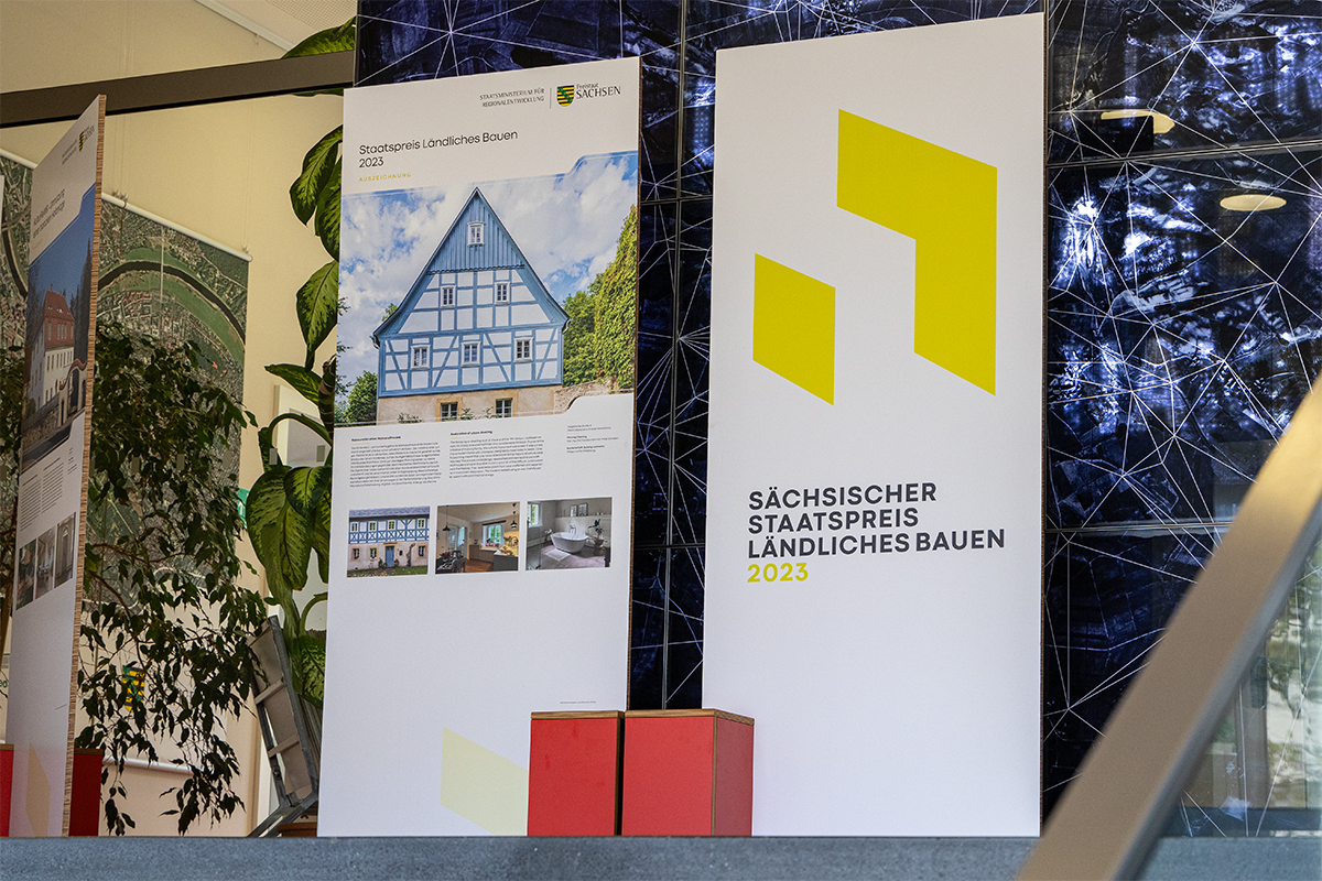 Die Ausstellung zum Staatspreis Ländliches Bauen besteht aus 14 mannshohen Tafeln und ist noch bis Ende Mai im Eingangsbereich des GeoSN sowie in den beiden Mittelfoyers zu sehen.