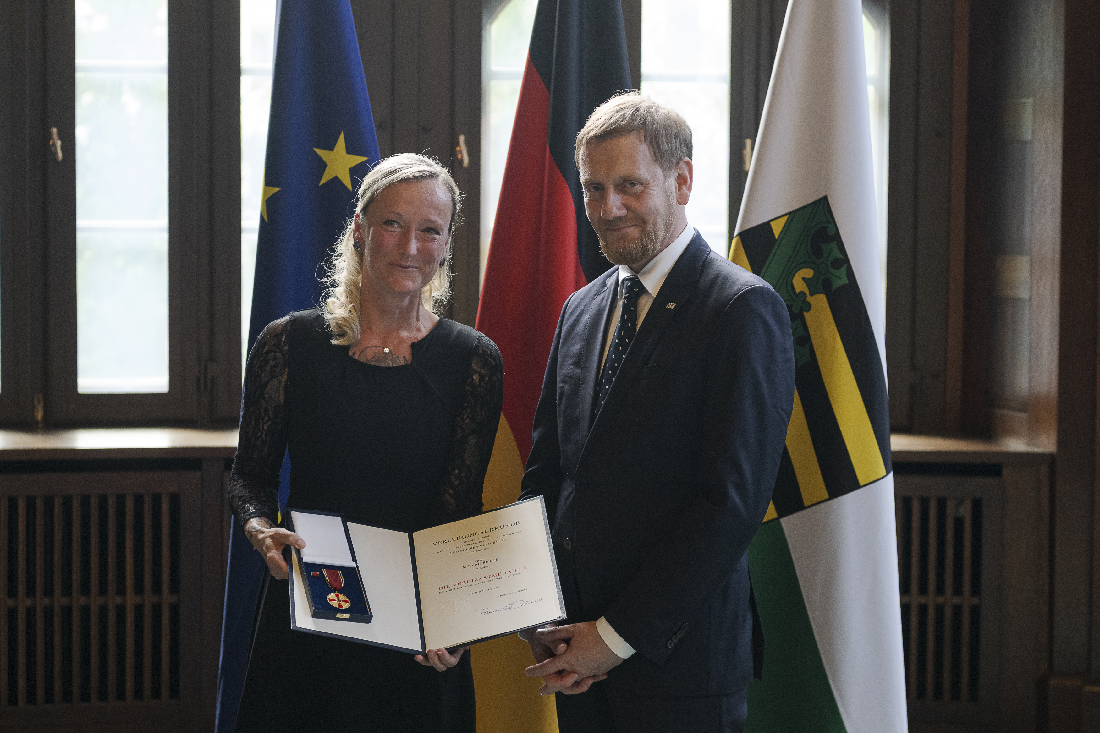 Ministerpräsident Michael Kretschmer überreicht den Verdienstorden der Bundesrepublik an Melanie Reiche (Dresden).