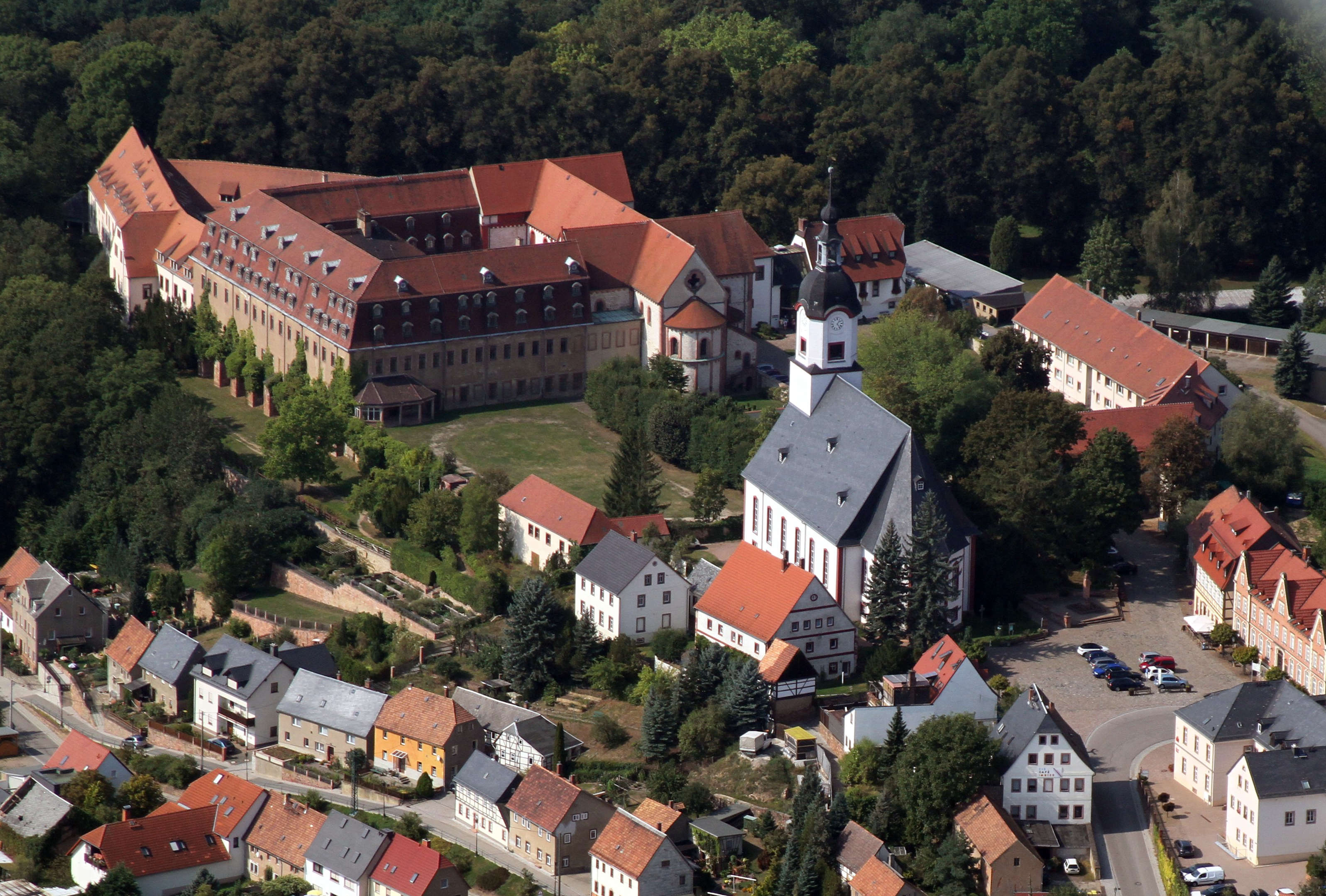 Foto: Luftaufnahme von Wechselburg mit der Schloss- und Klosteranlage (© Andrea Funke)