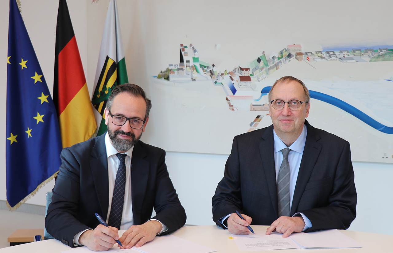Wissenschaftsminister Sebastian Gemkow (li.) und der kommissarische Rektor der Dualen Hochschule Sachsen, Prof. Dr.-Ing. Frank Schweitzer bei der Unterzeichnung der Zielvereinbarung für die Duale Hochschule Sachsen DHSN