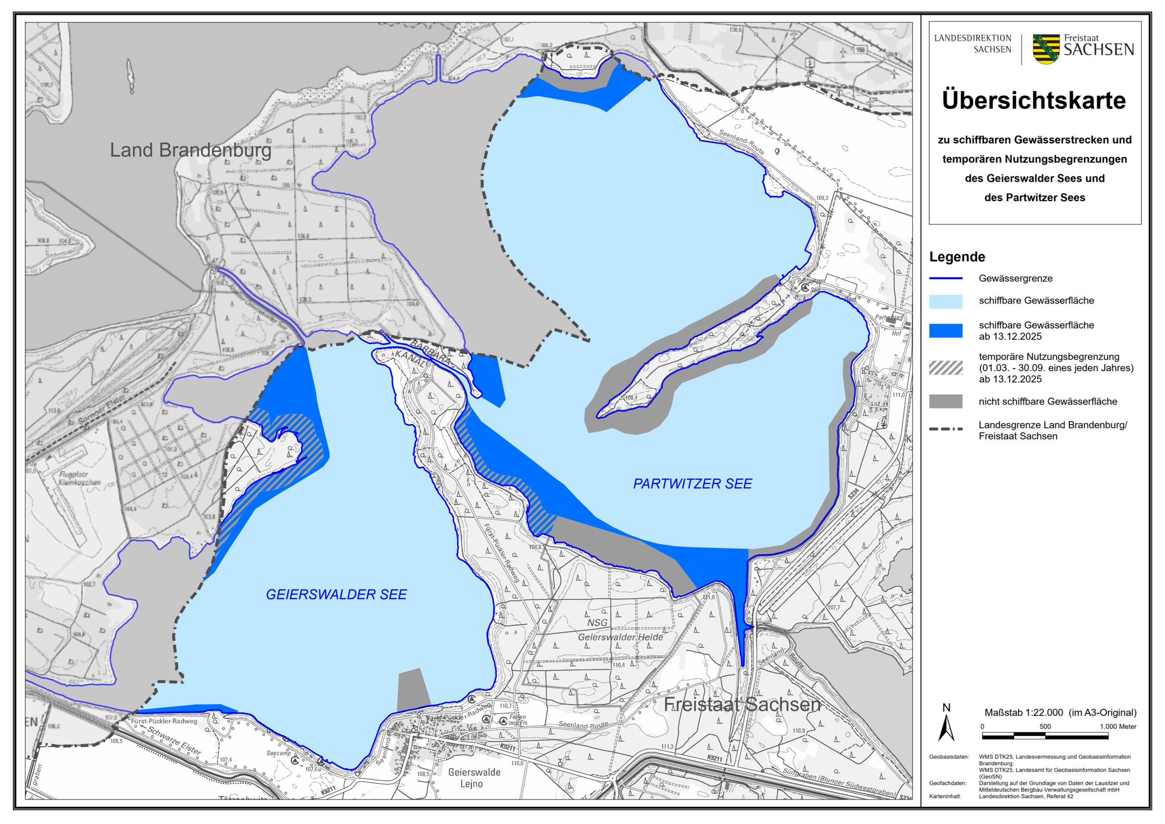 Übersichtskarte über die schiffbaren Gewässerstrecken auf dem Geierswalder See und Partwitzer See (Stand 12. Dezember 2025)