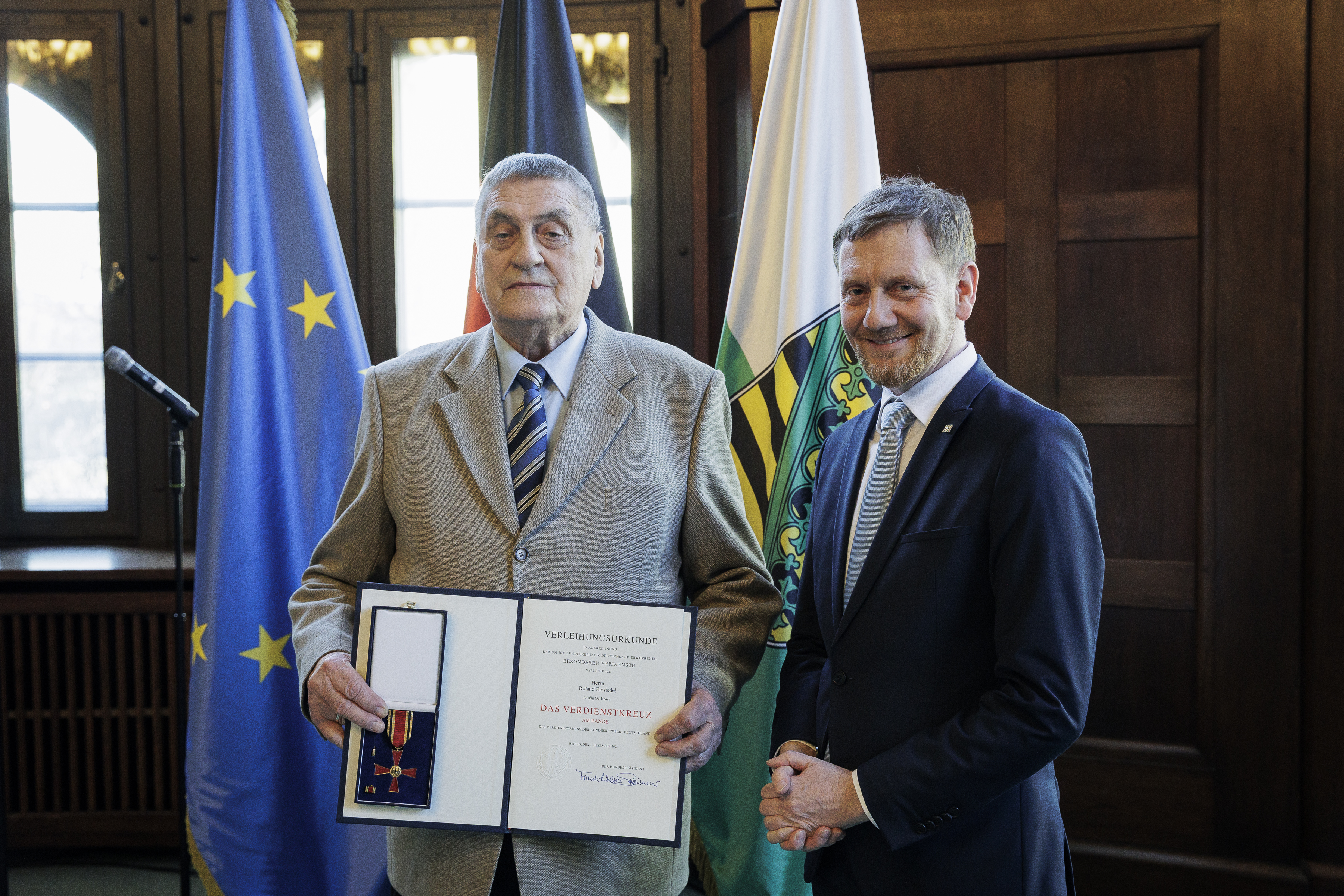 Ministerpräsident Michael Kretschmer überreicht den Verdienstorden der Bundesrepublik an Roland Einsiedel aus Laußig, OT Kossa.