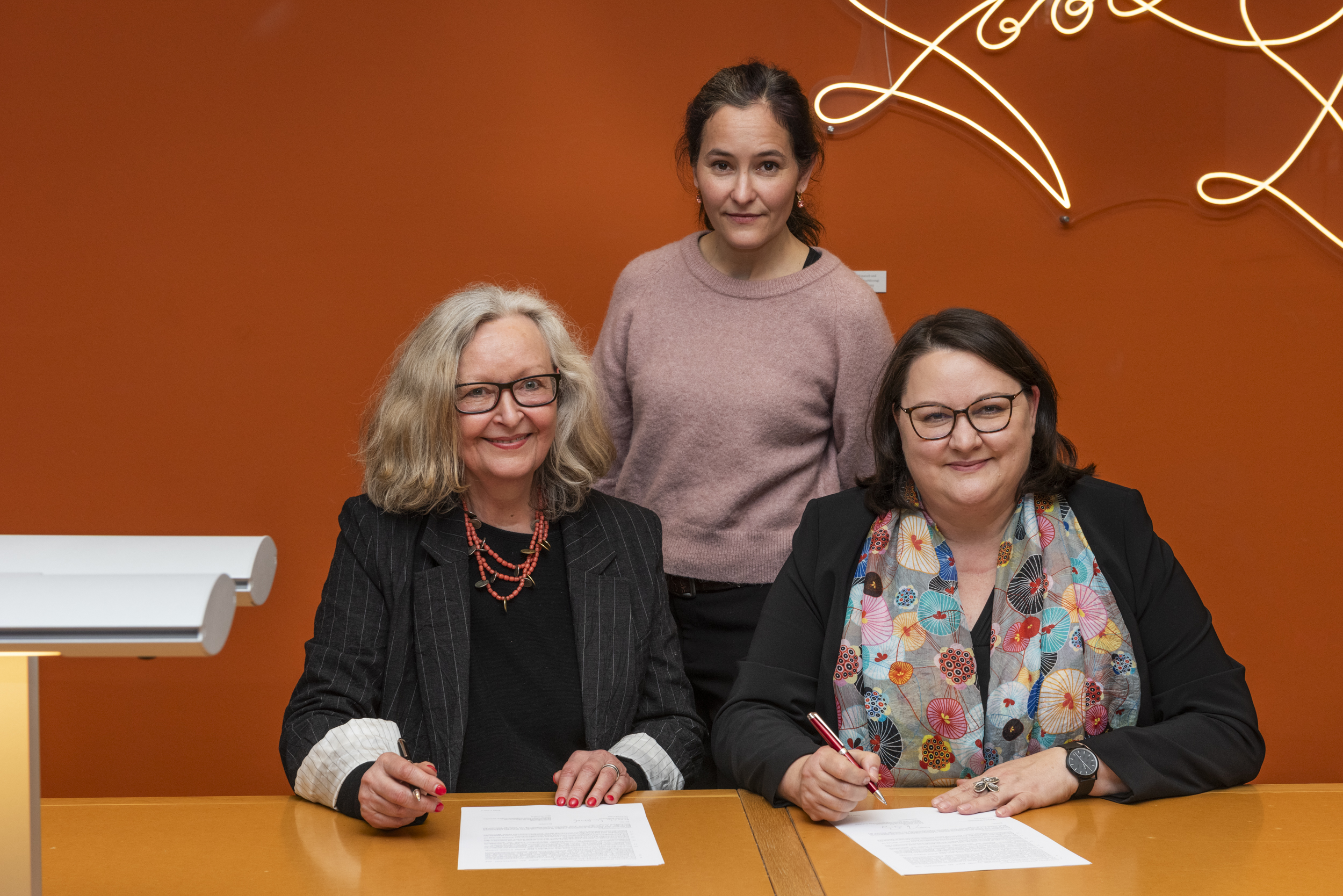 Maraike Wittbrodt (links, Tochter von Ursula Winnington) und Katrin Stump (rechts, Generaldirektorin der SLUB) unterzeichnen den Schenkungsvertrag zur Übernahme des Nachlasses von Ursula Winnington. In der Mitte: Enkelin Lilly Böhm