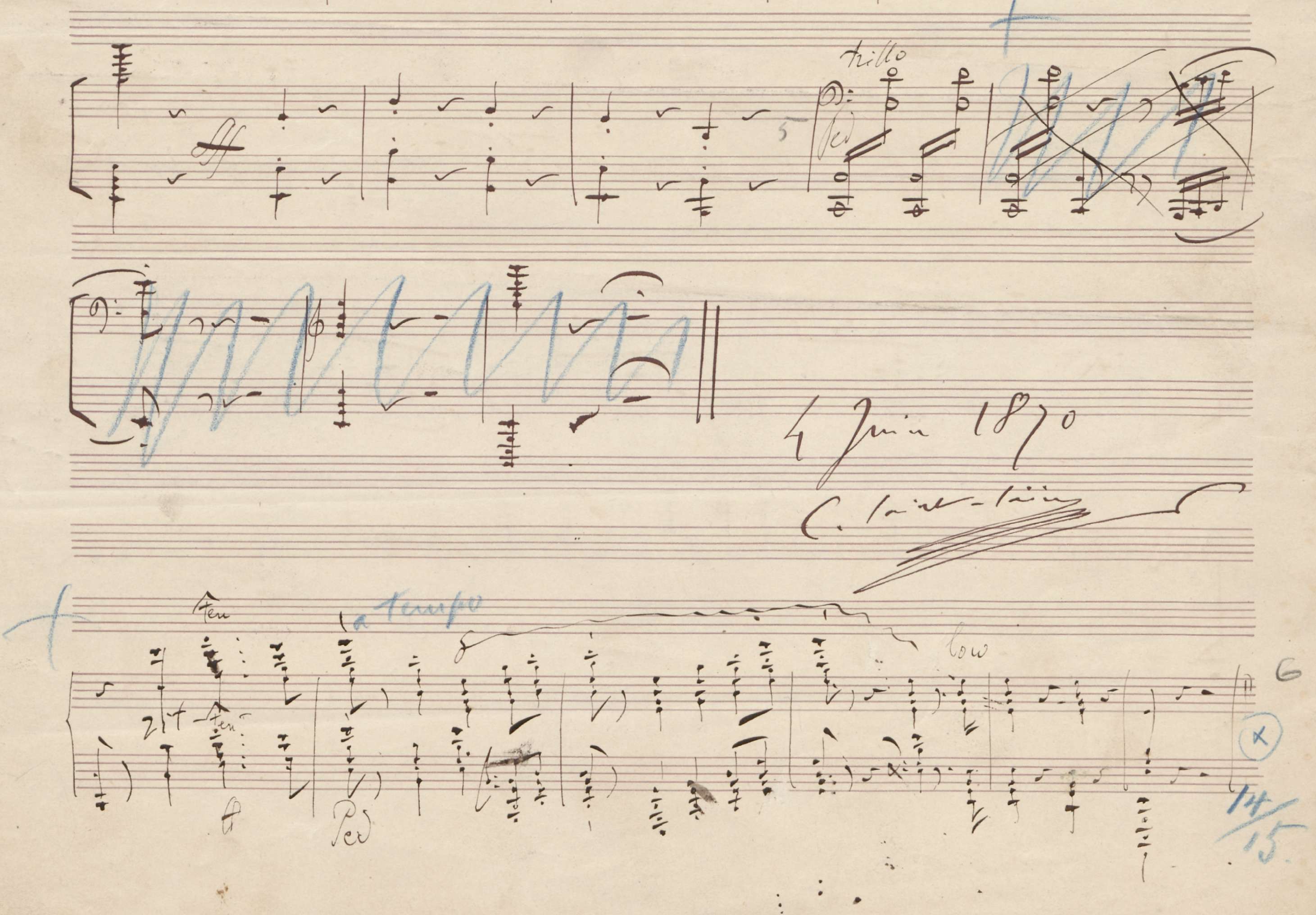 Autographes Manuskript von Camille Saint-Saëns (Improvisationen über Liszt's Beethoven Kantate)