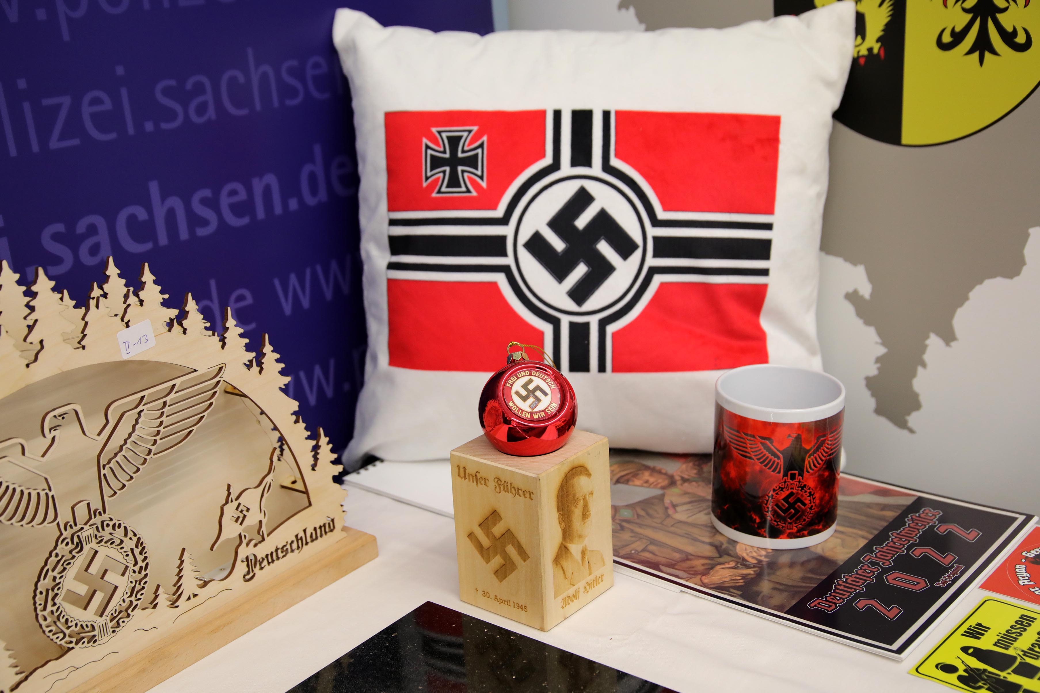Tatsächlich fanden die Ermittler in den Wohnräumen und einer Werkstatt über 100 unterschiedlichste professionell hergestellte Gegenstände, die mit NS-Symbolen oder Porträts von Persönlichkeiten aus der Zeit des Nationalsozialismus versehen waren. Dabei handelte es sich unter anderem um Schwibbögen, Räuchermännchen, Tassen, gravierte Gläser und Schieferplatten, Christbaumschmuck, Büsten, T-Shirts und Kalender. Die gefundenen Gegenstände waren offenbar für den Verkauf bestimmt.