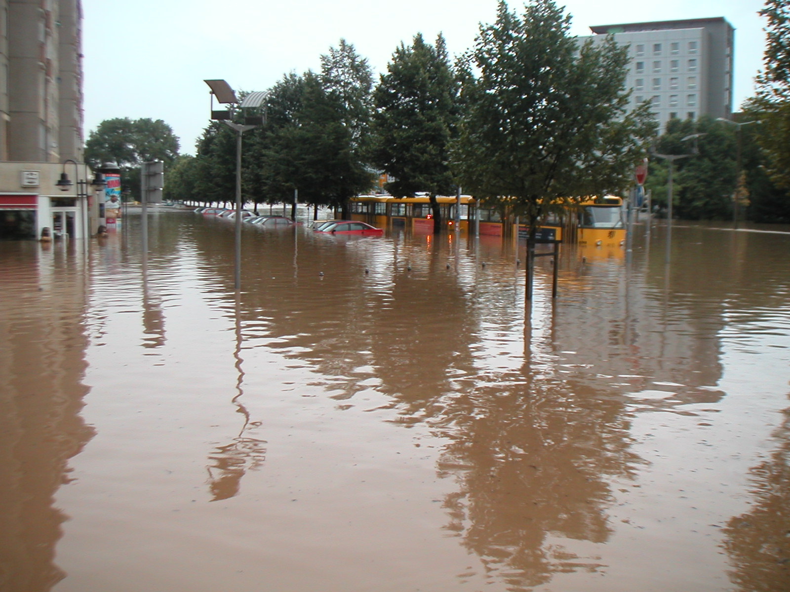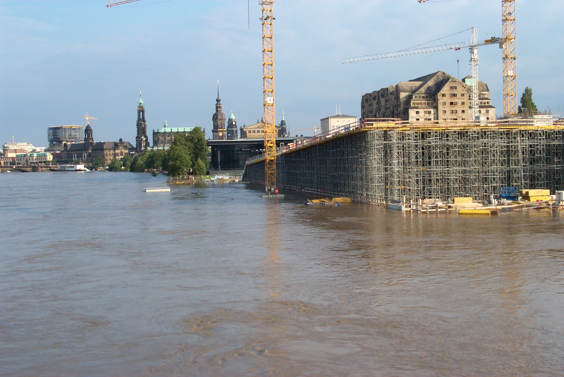 Im August 2002 wurden in Sachsen zuerst die Flüsse aus dem Erzgebirge, die Mulde und die Nebenflüsse der Elbe zu reißenden Strömen, bis schließlich die Elbe das gesamte Elbtal überflutete. Ab dem 12. August hatte es im Erzgebirge 24 Stunden lang ununterbrochen geregnet. An der Station Zinnwald-Georgenfeld fielen in dieser Zeit 312 Liter Regen pro Quadratmeter – der bisher höchste Tagesniederschlag, der je in Deutschland gemessen wurde. Durch die Täler schossen Sturzfluten, die Geröll und Autos mitrissen, Brücken und Häuser zerstörten. Nach den Sturzfluten kamen die Wassermassen der Elbe aus Tschechien nach Sachsen. Am Pegel Schöna, direkt nach der tschechischen Grenze, sorgte die Hochwasserwelle am 16. August für einen Höchststand von 12,04 Metern. In den Morgenstunden des 17. August erreichte die Hochwasserwelle Dresden und ließ den Elbepegel auf 9,40 Meter ansteigen – normal sind circa 1,50 Meter. Die verheerende Hochwasserkatastrophe in Sachsen kostete 21 Menschen das Leben und verursachte Schäden in Höhe von rund 8,6 Milliarden Euro.