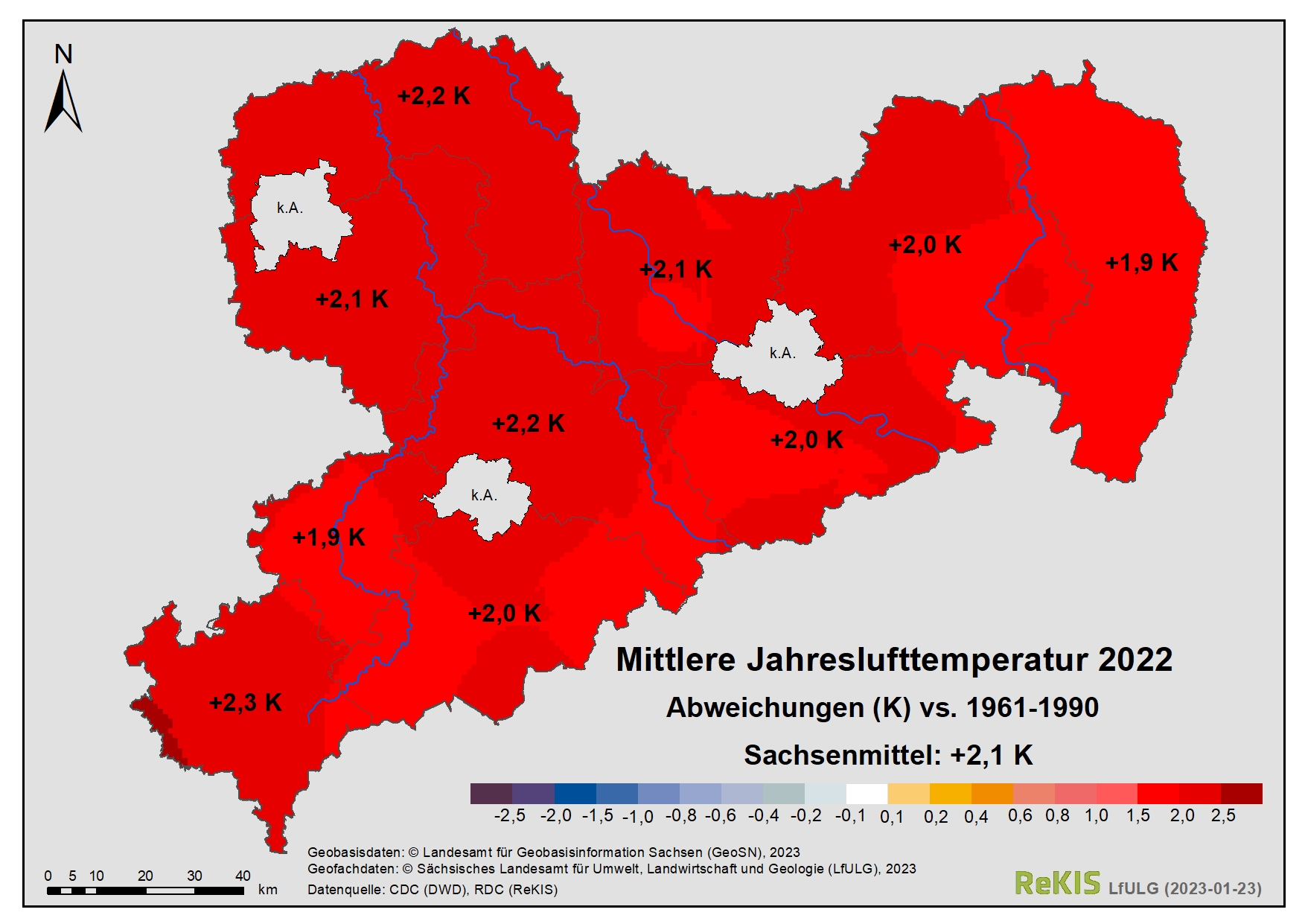 - [Foto] Grafik: Mittlere Jahreslufttemperatur 2022 (Abweichungen im Vergleich zur Referenzperiode 1961-1990)