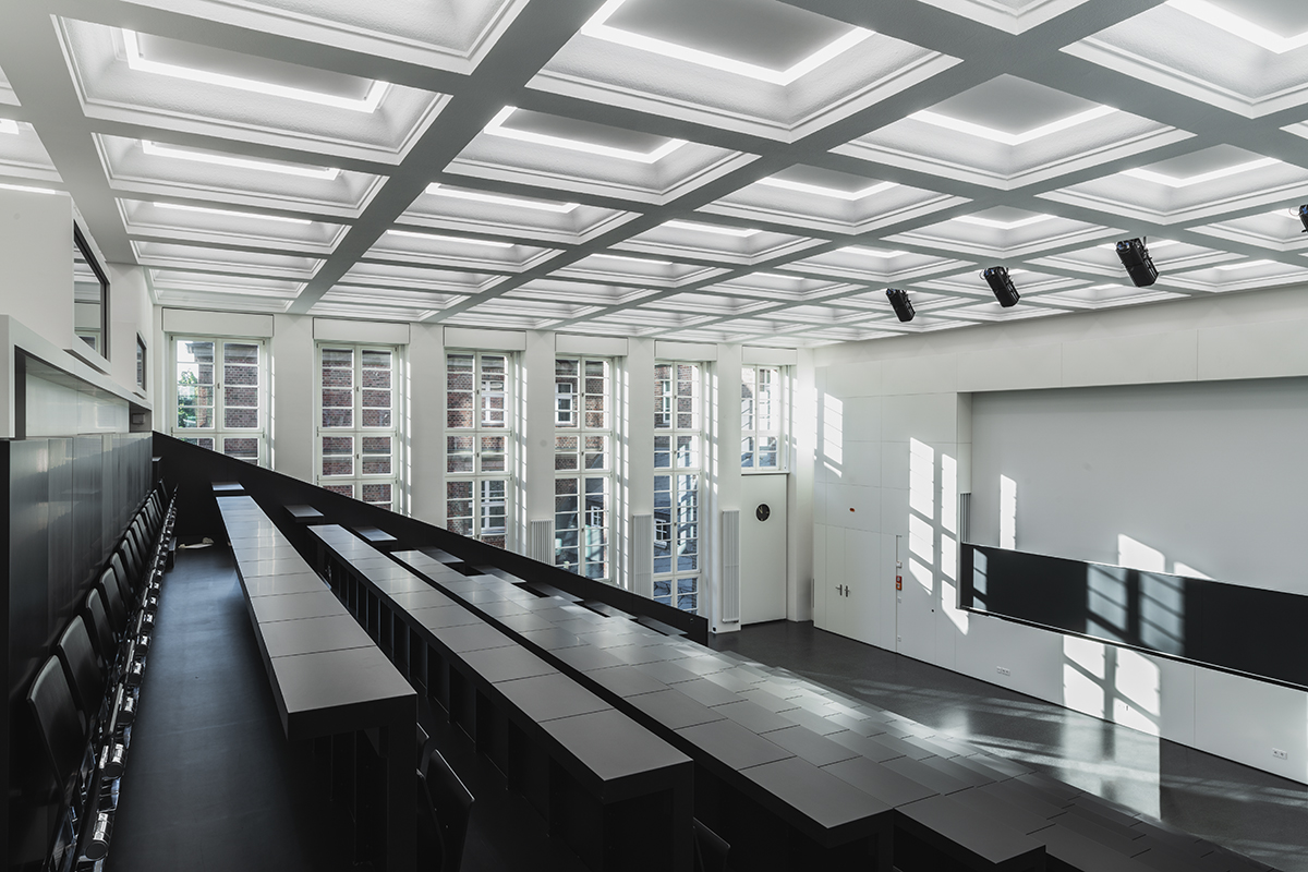 Die Architektur der 1920er-Jahre zeigt sich auch nach der Sanierung in vielen Details, so zum Beispiel in den Treppenräumen, der rekonstruierten Kassettendecke im Hörsaal oder den historischen Trinkbrunnen. 700 Holzfenster wurden unter denkmalpflegerischen Gesichtspunkten ersetzt. Dabei wurden historische, bleiverglaste Schmuckdetails gesichert und wieder integriert.