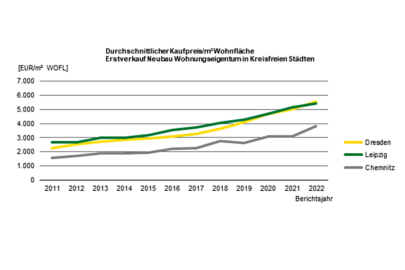Mit einem Anteil von rund 80 Prozent an allen Transaktionen entfallen auf den Teilmarkt des Sondereigentums (Wohnungs- und Teileigentum) in den drei sächsischen Großstädten die meisten Erwerbsvorgänge. 2022 wechselten 8.999 Wohn- und 464 Gewerbeeinheiten (Teileigentum) den/die Eigentümer/in. Das sind zwar deutlich weniger als im Vorjahr (rd. 18 Prozent), die Preise zogen hingegen deutlich an. Für eine neu errichtete bzw. frisch sanierte erstverkaufte Eigentumswohnung liegen die Kaufpreise in Dresden und Leipzig jeweils bei rd. 5.500 bzw. 5.900 Euro/m² Wohnfläche, in Chemnitz bei 3.800 bzw. 4.200 Euro/m² Wohnfläche. Bei den weiterverkauften Bestandswohnungen liegt des Preisniveau in Dresden und Leipzig bei rd. 2.900 Euro/m² Wohnfläche und in Chemnitz bei rd. 1.300 Euro/m² Wohnfläche.