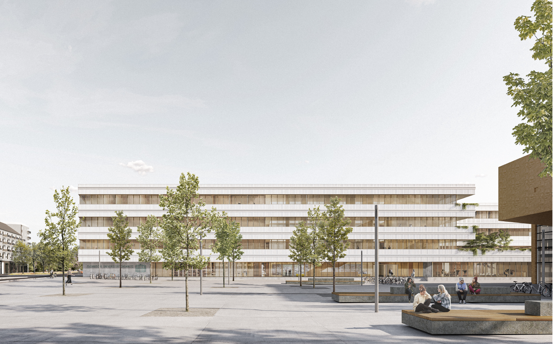 Dem Siegerentwurf "gelingt mit einer einfachen Kubatur ein klarer Auftritt zum Campusplatz. Zwei zueinander versetzte Riegel bilden einen klaren Gebäudeschwerpunkt." Weiter heißt es, dass die an den Stirnseiten entstehende eingeschossige Sockelausbildung hinsichtlich der raumweitenden Reaktion in Richtung Hörsaalgebäude überzeuge.