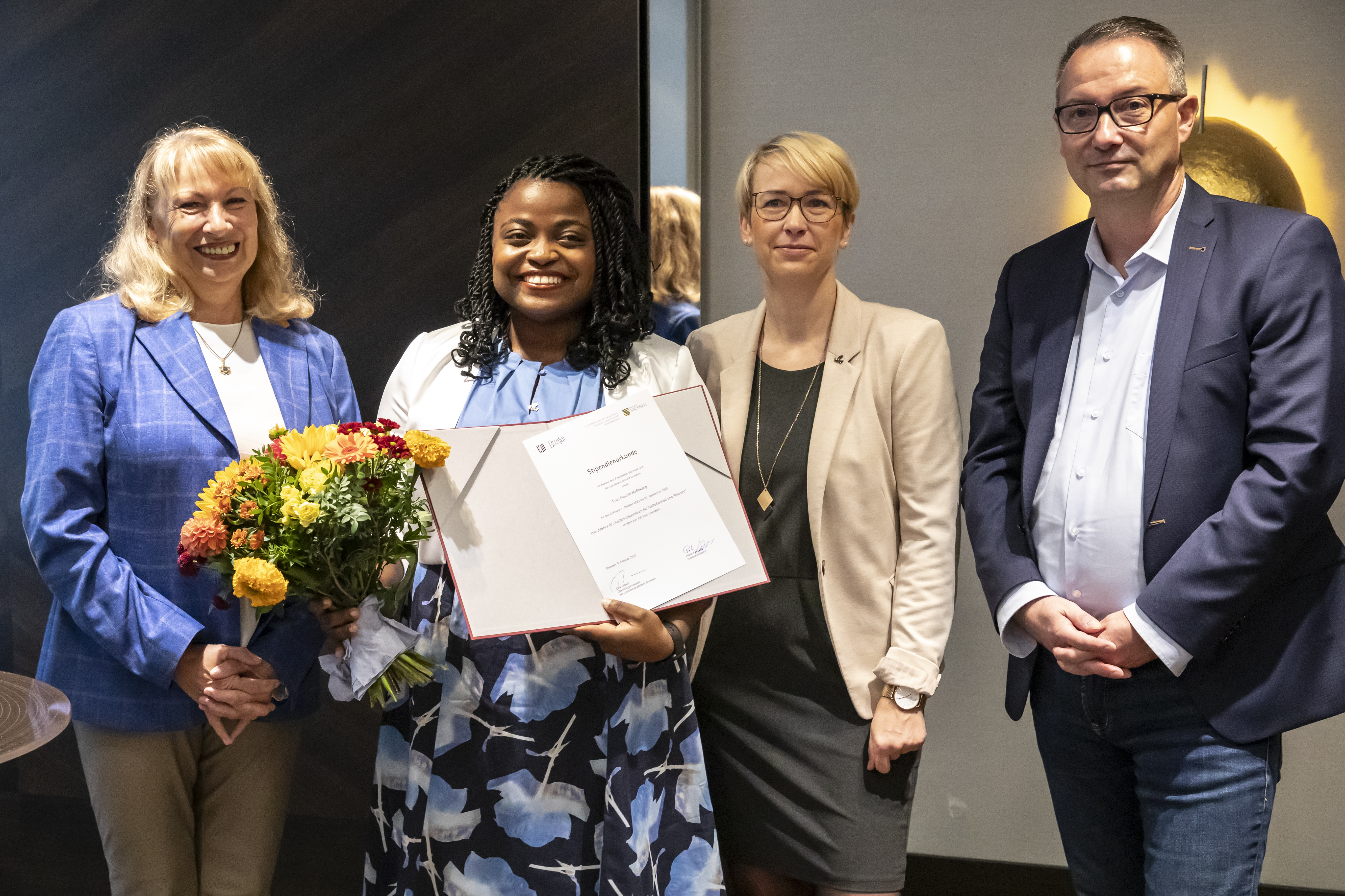 Die 32jährige gebürtige Kamerunerin Flaurita Maffokang ist die neue Stipendiatin des »Marwa El-Sherbini-Stipendiums für Weltoffenheit und Toleranz«. Staatsministerin Petra Köpping und der Erste Bürgermeister der Stadt Dresden, Jan Donhauser, überreichten der Masterstudentin der sozialen Arbeit an der Evangelischen Hochschule Dresden (EHS) heute in einer Feierstunde das Stipendium.