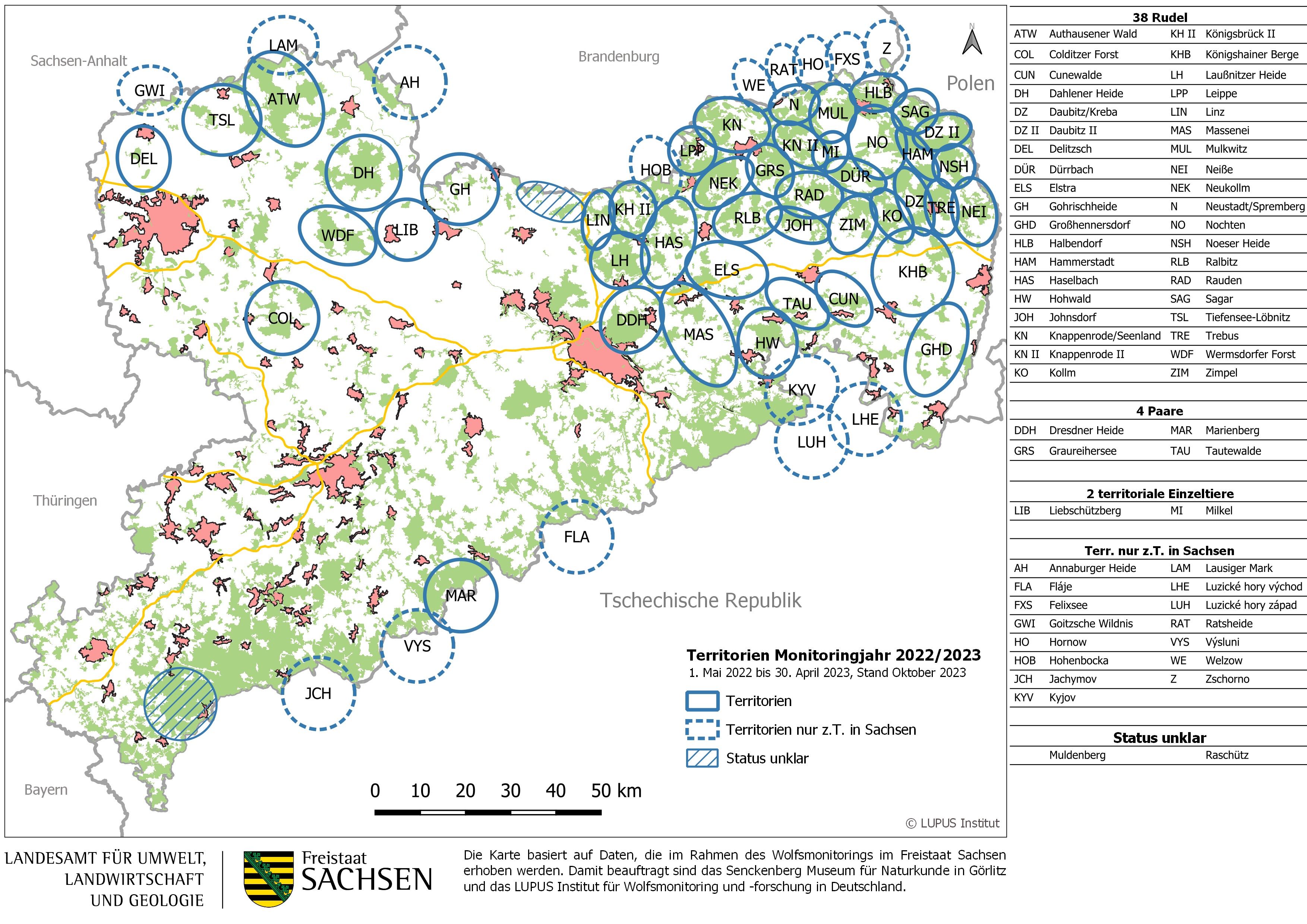 Der Schwerpunkt des Wolfsvorkommens liegt nach wie vor in Ostsachsen. Dort wird auch die höchste Dynamik in Bezug auf die Etablierung und Verschiebung von Wolfsterritorien beobachtet. Dadurch ist ein unmittelbarer Vergleich der Anzahl an Territorien zu vorherigen Monitoringjahren nicht möglich. So haben sich im Monitoringjahr 2022/2023 in Ostsachsen das Wolfspaar Graureihersee sowie die drei Rudel Elstra, Leippe und Ralbitz neu etabliert. Gleichzeitig konnten die beiden Wolfsterritorien Stolpen-Hohenstein und Rosenthal nicht mehr nachgewiesen werden. Unklar ist derzeit auch, ob das Rudel Raschütz noch existiert.