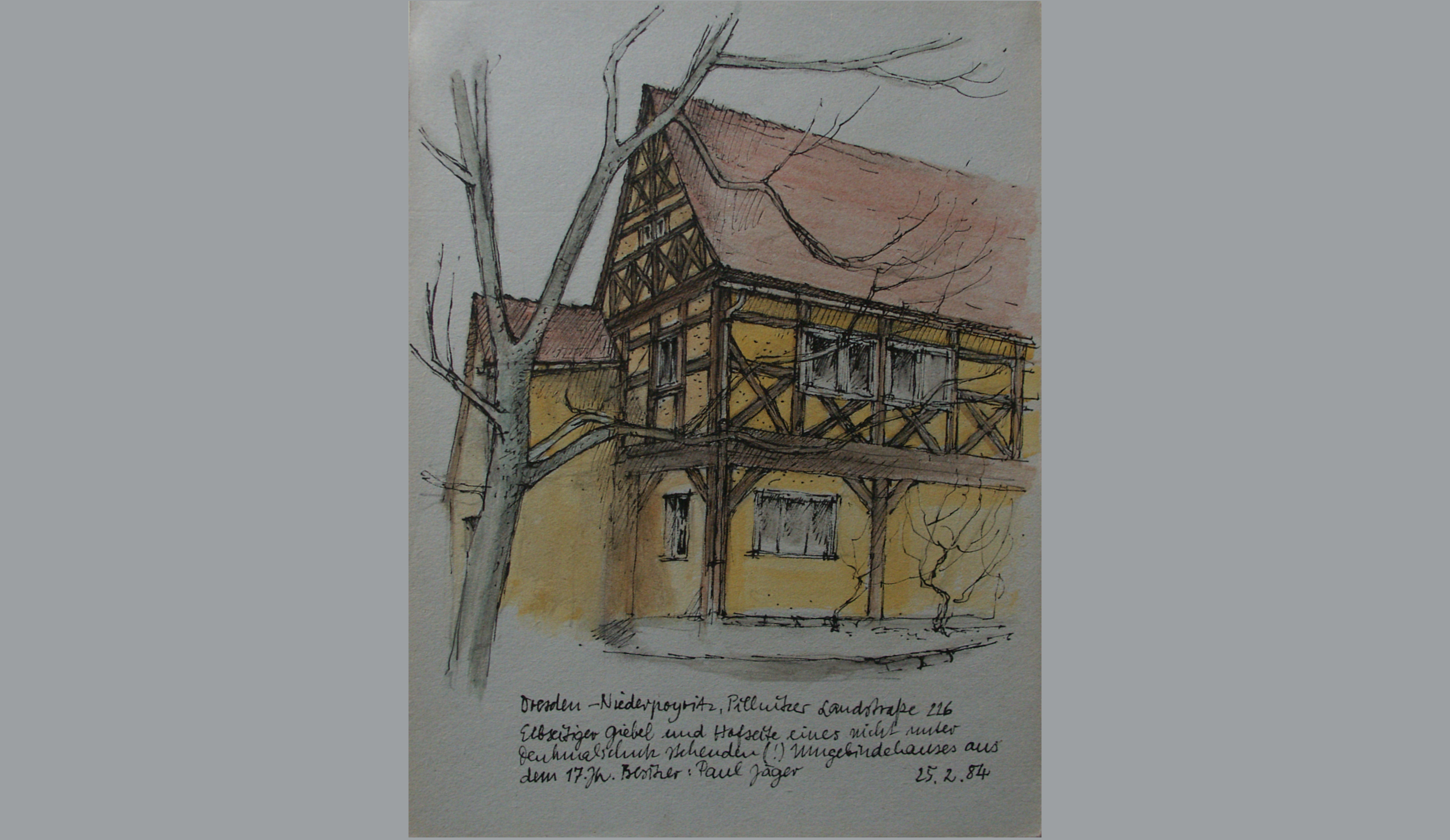 Die Hausaustellung »Rückblicke« in den Diensträumen des Landesamtes für Denkmalpflege (LfD) zeigt ausgewählte Zeichnungen, Bauaufnahmen und Aquarelle von Dr. Jochen Helbig aus 70 Jahren Schaffenszeit: von 1950 bis 2020. Sie stellen einzigartige Dokumente für die Volksbauweise in Sachsen und Umgebung dar. Denn zahlreiche der Umgebinde- oder Fachwerkhäuser, der Wirtschaftsgebäude oder Hofanlagen, ihre konstruktiven und gestalterischen Details oder ihre Ausstattung sind inzwischen verloren. Andere, wie der vermutlich älteste Blockspeicher Sachsens in Niederlungwitz bei Glauchau, auf 1492 datiert, oder die um 1730 angelegte Exulantensiedlung in Zinnwald-Georgenfeld blieben erhalten und zeugen in Jochen Helbigs Dokumentationen von der Vielfalt des ländlichen Bauens. Die Breite seines Schaffens wird in der Ausstellung beginnend mit Studentenmitschriften, Skizzenbüchern und Urlaubszeichnungen über Exkursionsführer, Gebäude- und Ortsdokumentationen und Lehrmaterialien bis hin zu Grußkarten, Illustrationen und Landschaftsaquarellen vorgestellt.