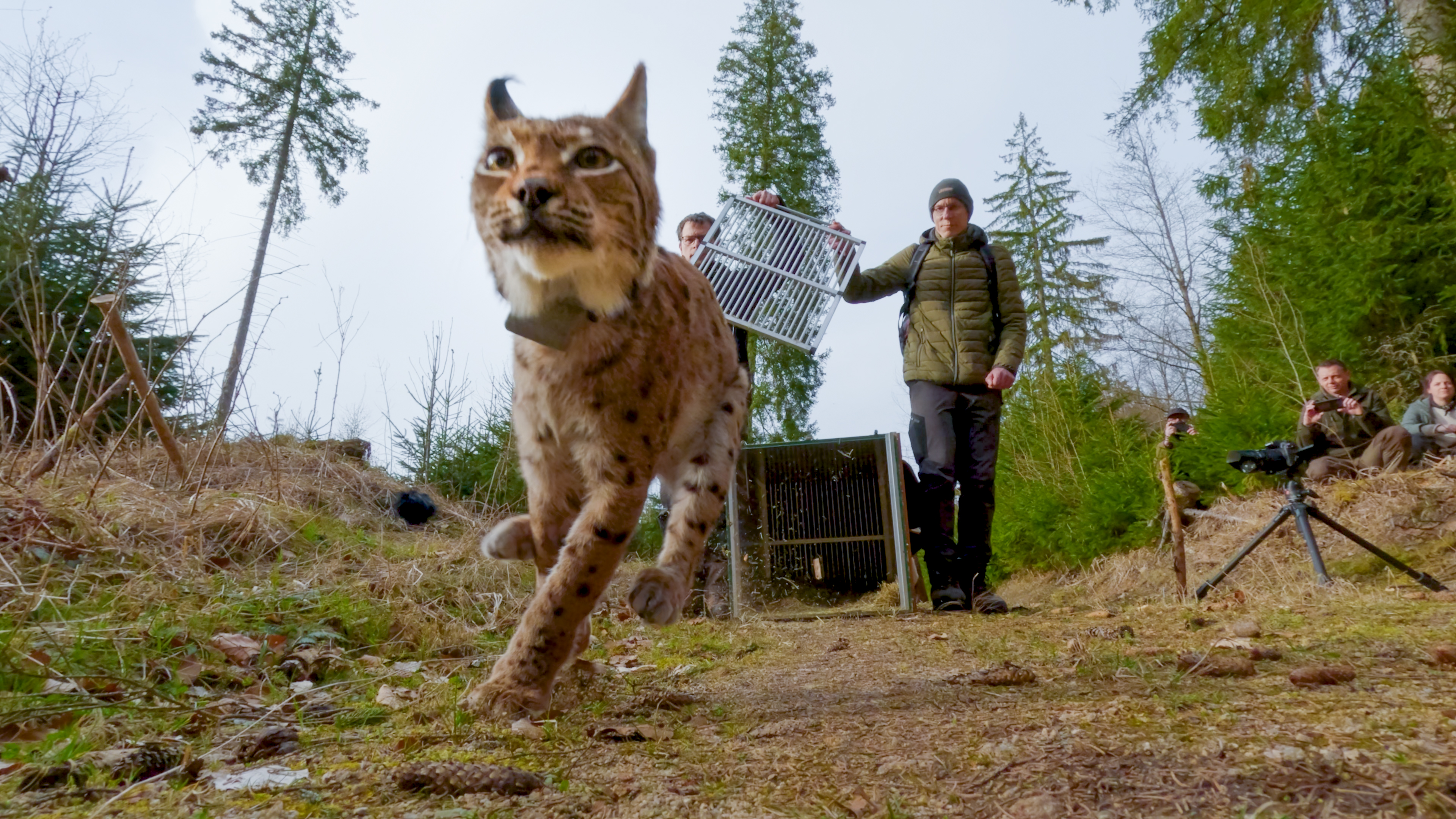Die beiden Auswilderungen von Juno und Nova sind störungsfrei und gut verlaufen. Beide Tiere waren gesund und in guter körperlicher Verfassung. Während Kuder Juno die Transportkiste langsam verließ und sich noch umschaute bevor er im Wald verschwand, sprang das Luchsweibchen Nova sofort heraus und entfernte sich zügig über eine Forstschneise.