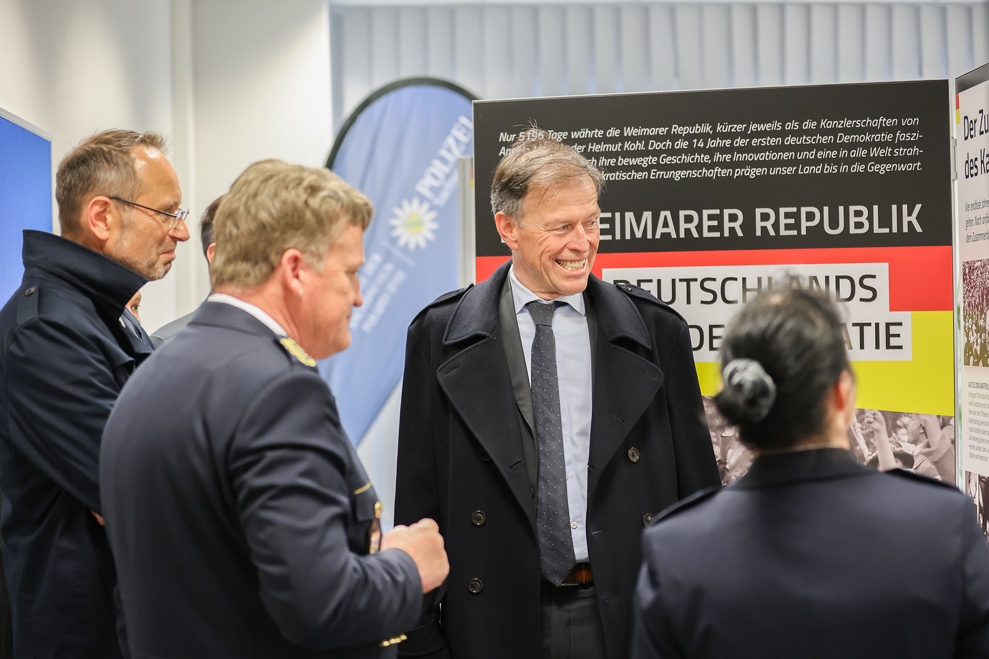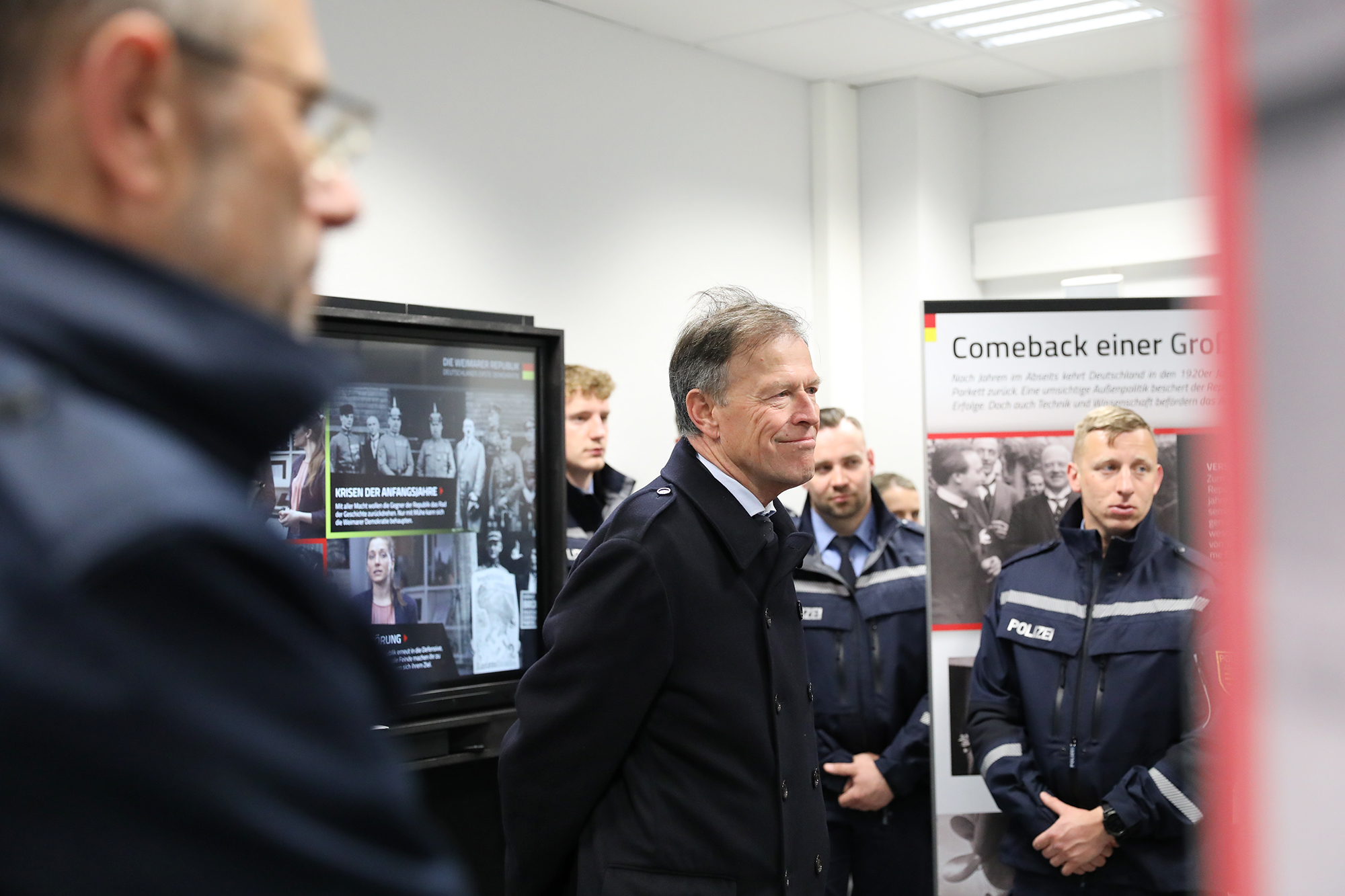 Markus Hünniger vom Weimarer Republik e. V. stellte die Ausstellung, deren Inhalte und Intention vor. Ein Besuch der Wanderausstellung wird in den kommenden Wochen ein fester Bestandteil der Gesellschaftslehre an der Polizeifachschule sein und darüber hinaus auch allen Bediensteten der Polizei offenstehen.