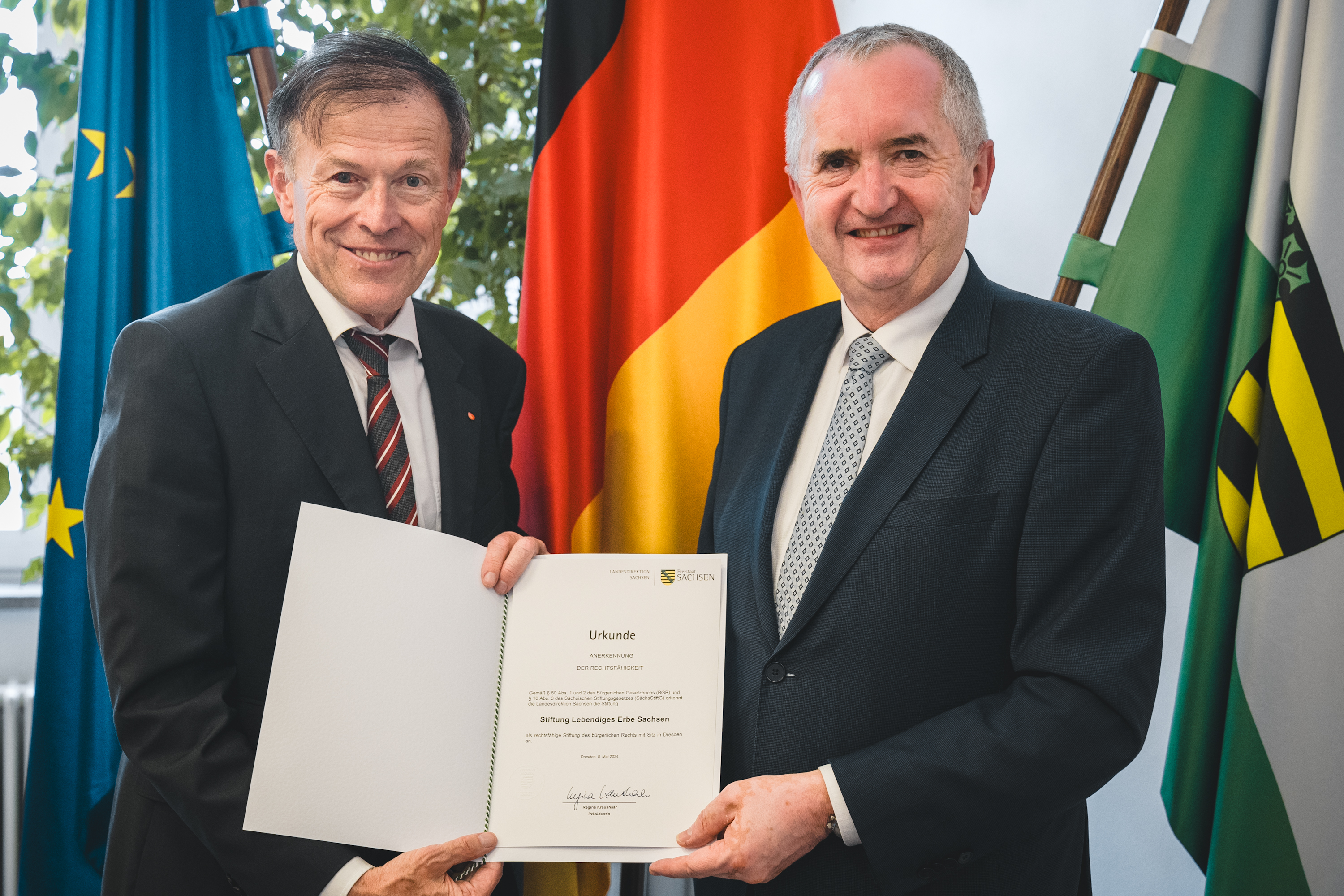 Staatsminister Thomas Schmidt hat heute (6. Juni 2024) im Beisein der Präsidentin der Landesdirektion Sachsen, Regina Kraushaar, in deren Funktion als Stiftungsaufsicht, die Stiftungsurkunde an den sächsischen Landtagspräsidenten Dr. Matthias Rößler übergeben. Dr. Rößler wurde von ihm zugleich zum ersten Vorsitzenden der Stiftung ernannt.