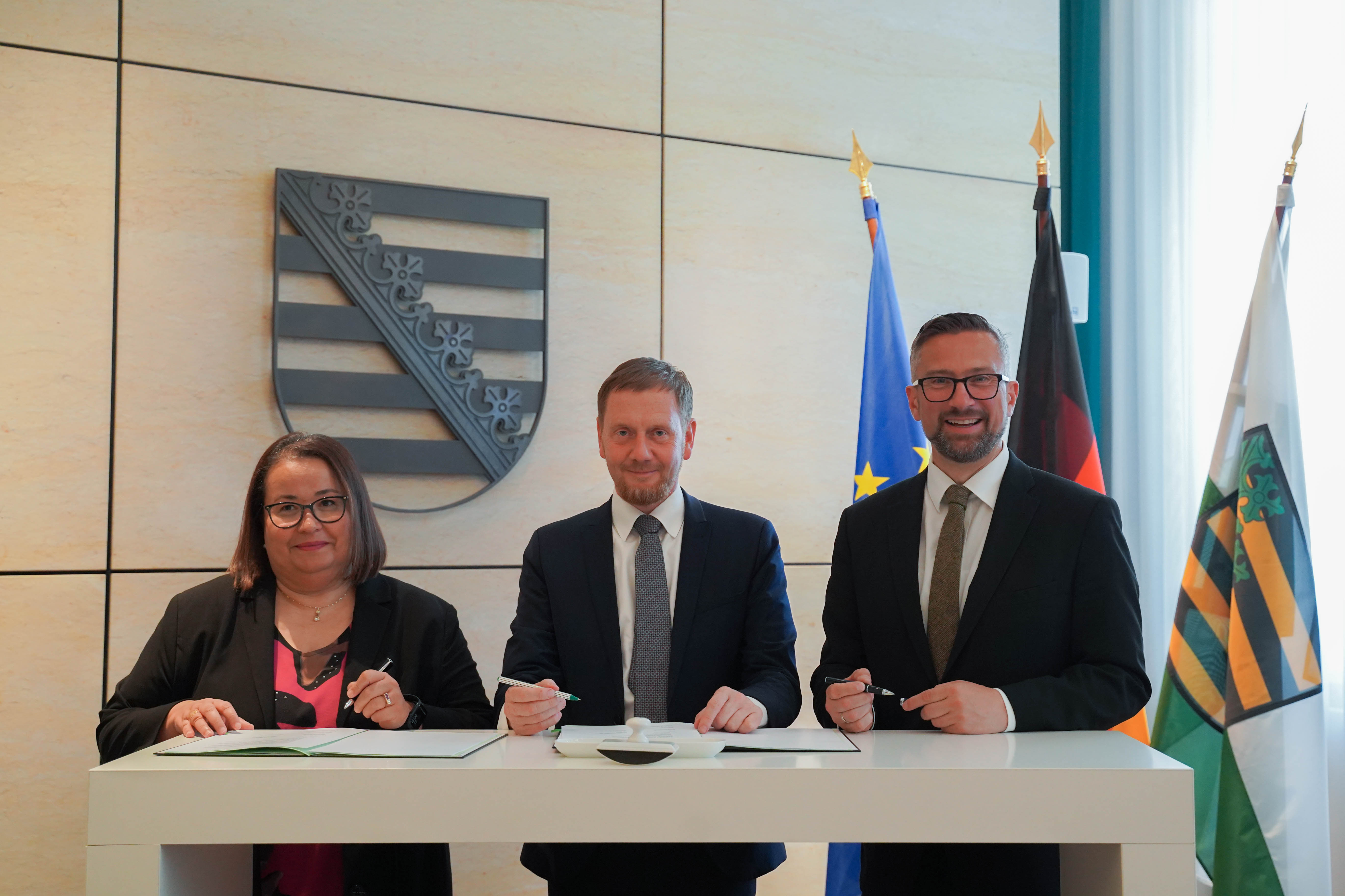 Ministerpräsident Michael Kretschmer, Wirtschaftsminister Martin Dulig und Badiaa Bazarbacha, Co-Managing Director, Vantage Towers Germany, haben die Rahmenvereinbarung heute (26. August 2024) in Dresden unterzeichnet. Der Freistaat standardisiert und beschleunigt somit weiter die Verfahren zur Nutzung von Staatsflächen zum Ausbau einer leistungsfähigen und flächendeckenden Mobilfunkinfrastruktur.