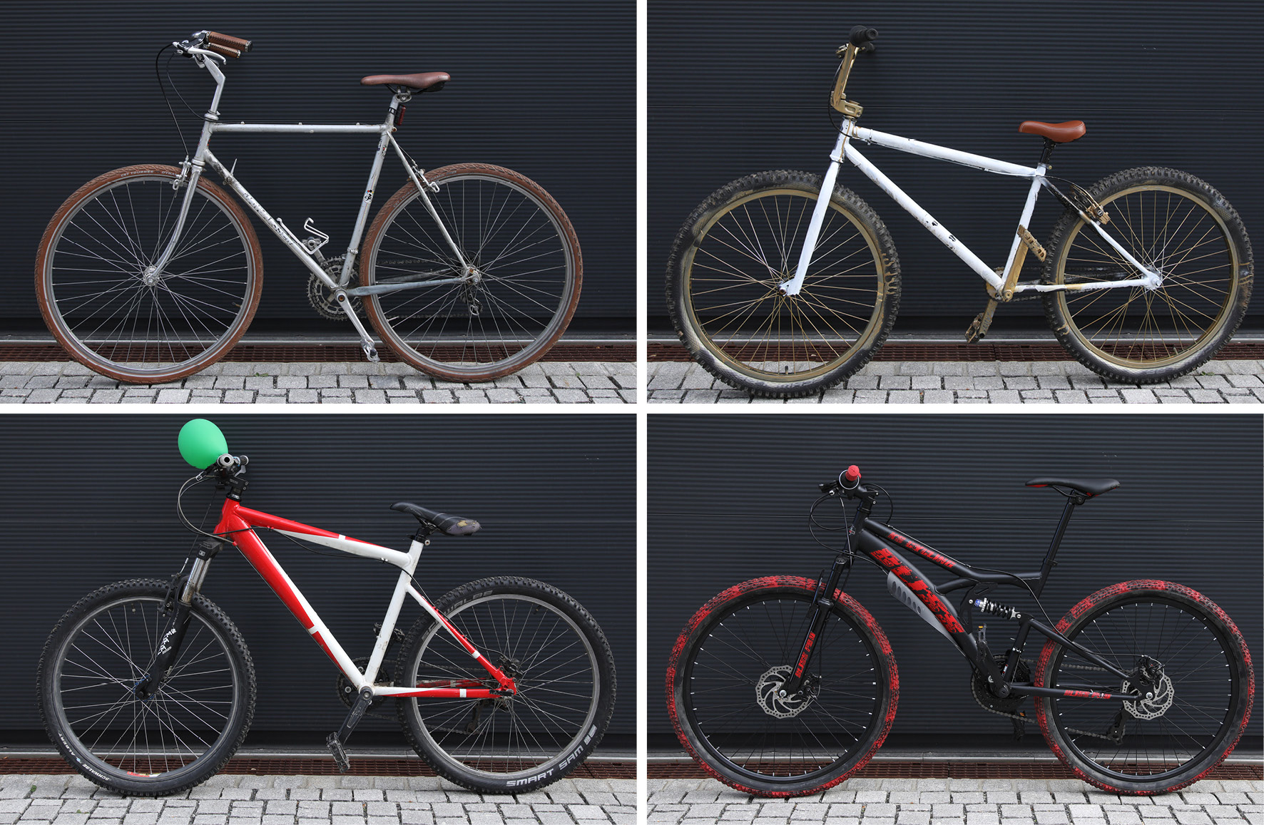– ein Mountainbike mit BMX-Lenker, braunem Ledersattel und hydraulischer Felgenbremse hinten, Grundfarbe vormals vermutlich schwarz, vom Tatverdächtigen weiß-gold übersprüht