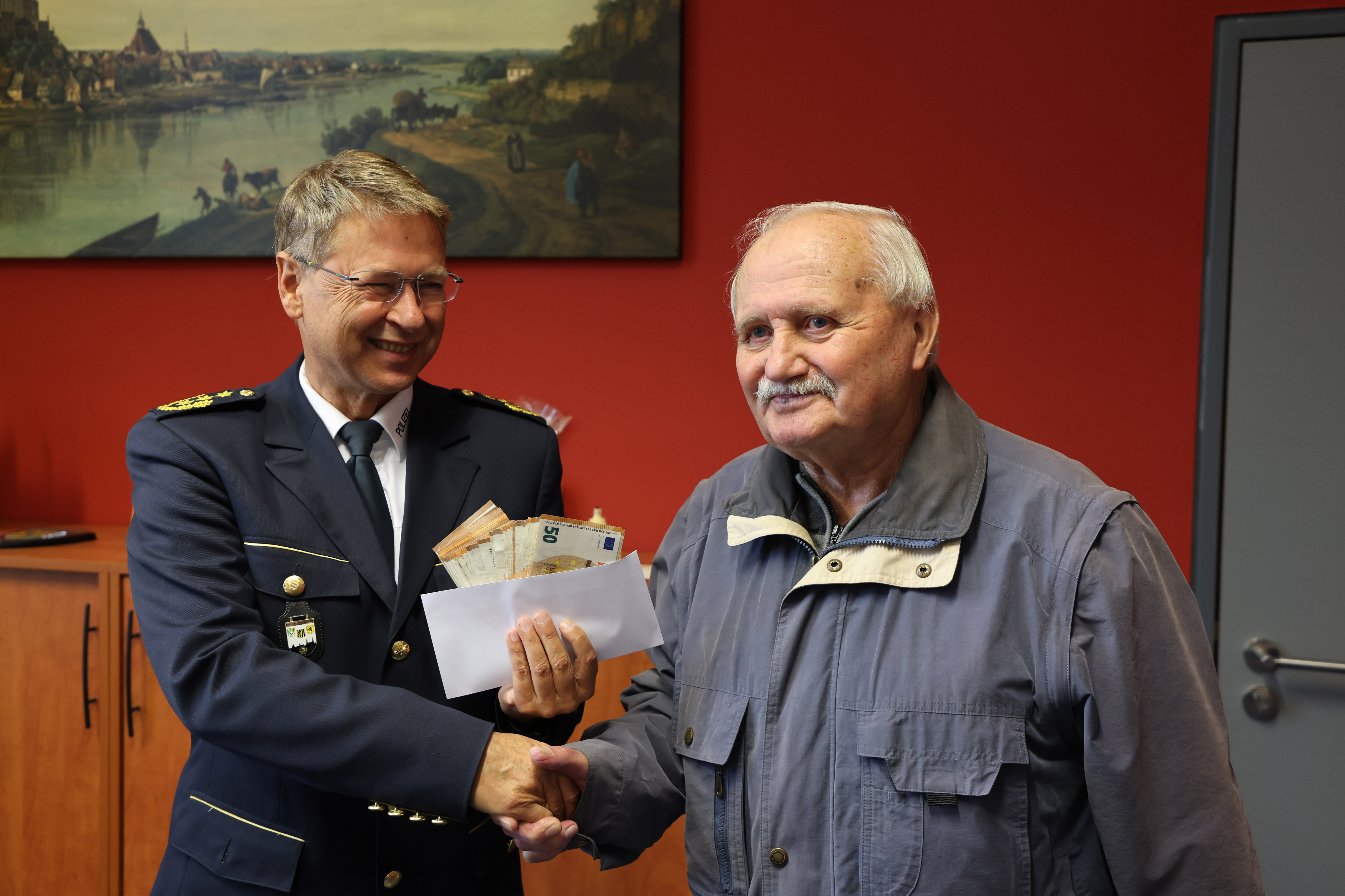 Falsche Polizisten haben einen Wilsdruffer (83) am Telefon um 5.000 Euro gebracht. Die Staatsanwaltschaft Dresden und Kriminalisten der Dresdner Polizei kamen den Tätern auf die Spur und konnten zwei Geldabholer (20, 21) auf frischer Tat stellen. Heute erhielt der 83-Jährige von Polizeipräsident Lutz Rodig (61) sein Geld zurück.