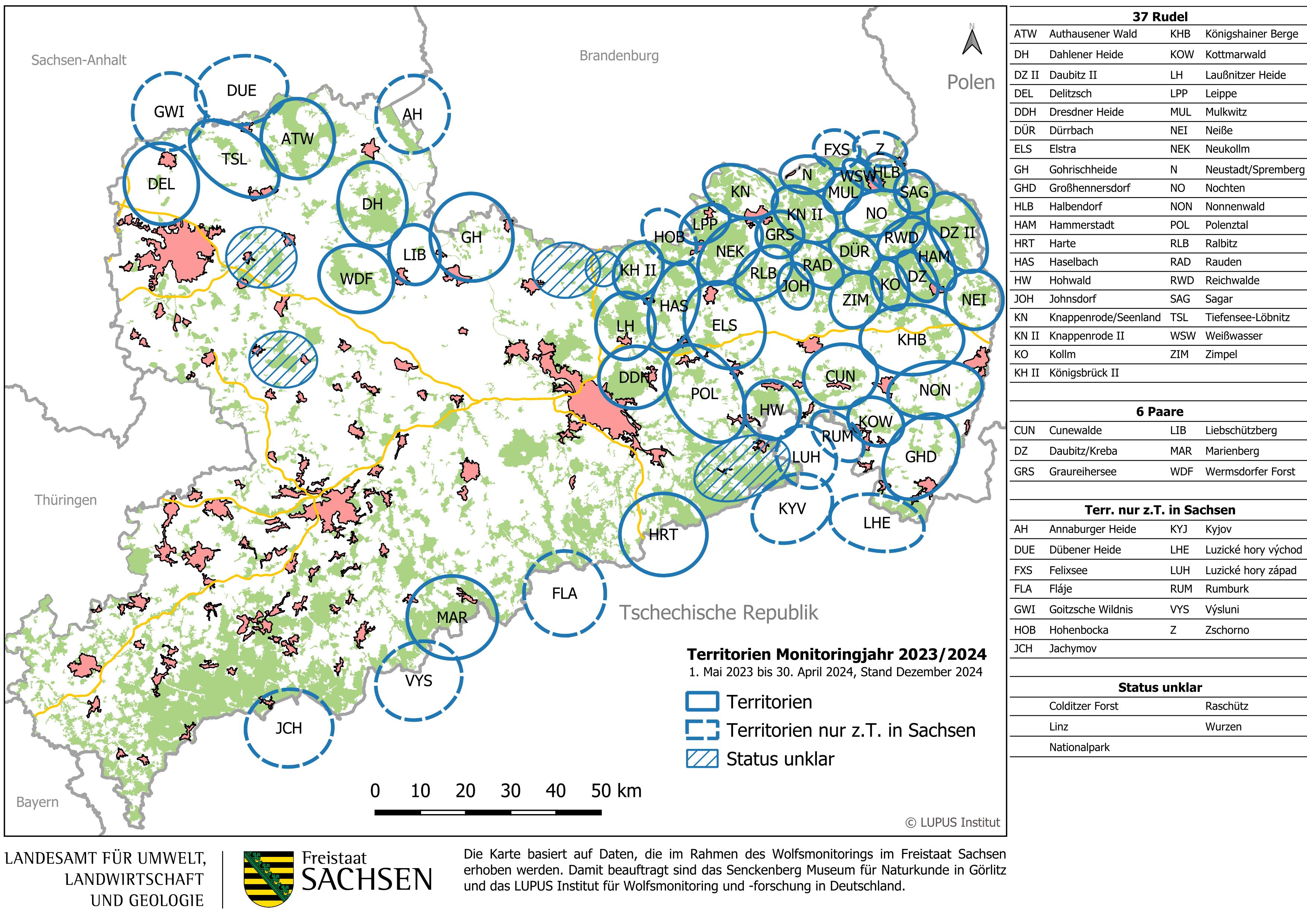 Mit 34 Territorien ist das sächsische Wolfsvorkommen östlich der Elbe nach wie vor am höchsten. Neu dazugekommen sind dort vier Territorien. Dabei handelt es sich um die Wolfsrudel Kottmarwald und Nonnenwald im südlichen Landkreis Görlitz sowie um die Rudel Reichwalde und Weißwasser im Norden des Landkreises. Gleichzeitig konnten die vier Wolfsterritorien Milkel, Linz, Tautewalde und Trebus in der Oberlausitz nicht mehr nachgewiesen werden.