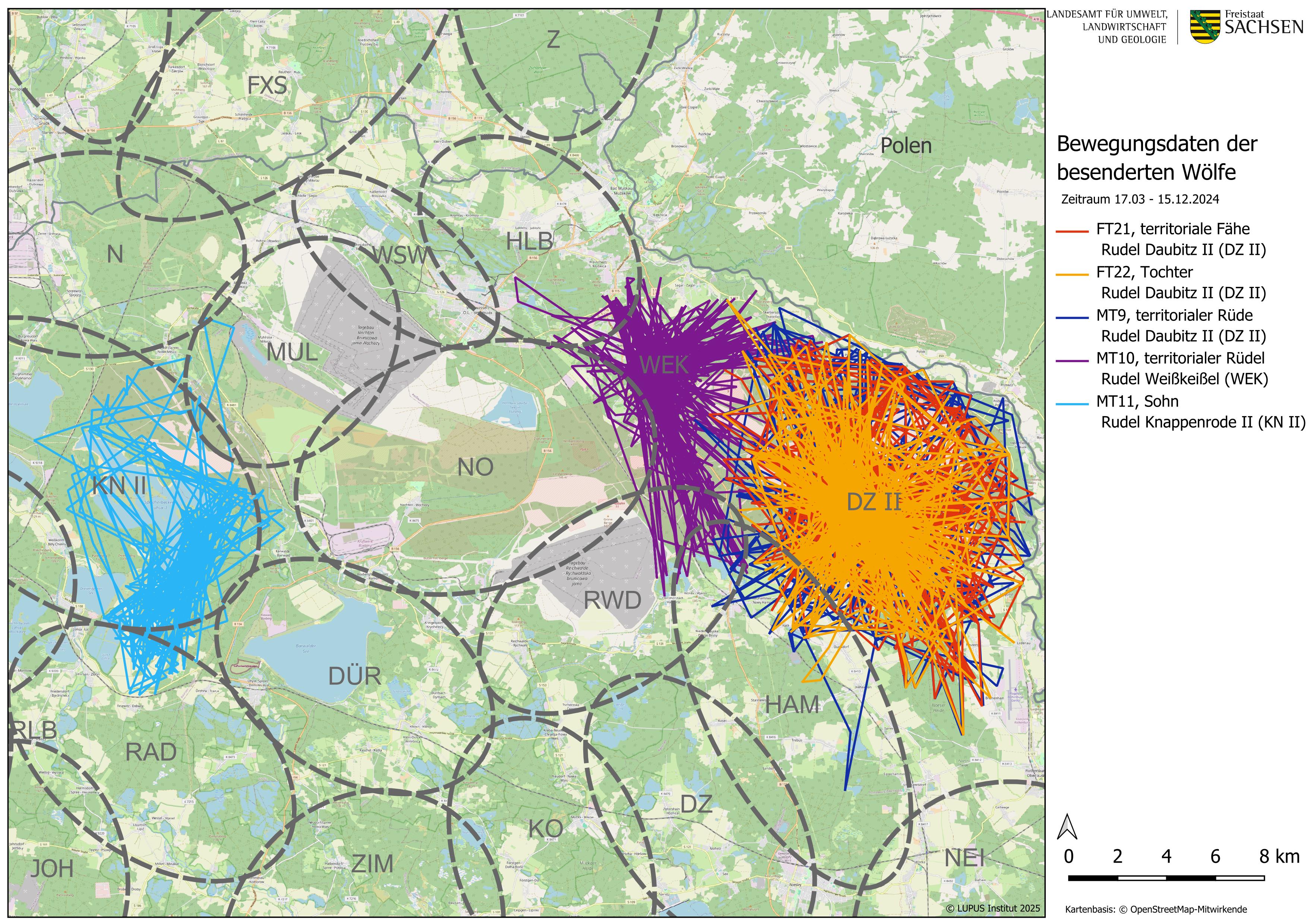 Bei den besenderten Wölfen FT21 »Tilda« und MT9 »Leon« handelt es sich um die Fähe und den Rüden des Rudels Daubitz II. FT22 »Yuma« ist eine gemeinsame Tochter der beiden Tiere aus dem Wurf 2023. Dass zeitgleich drei Tiere aus einem Rudel besendert werden konnten, ist bisher einmalig in Sachsen. Die Bewegungsprofile der beiden Elterntiere sind typisch für territoriale Wölfe. Kerngebiet des Rudels Daubitz II ist der östliche Teil des Truppenübungsplatzes Oberlausitz. Auch die Teichgebiete südlich davon werden intensiv von ihnen genutzt, das Waldgebiet der Noeser Heide jedoch kaum. FT22 »Yuma« hält sich noch im Elternterritorium auf. Ihr Streifgebiet überschneidet sich dabei fast vollständig mit dem ihrer Mutter.