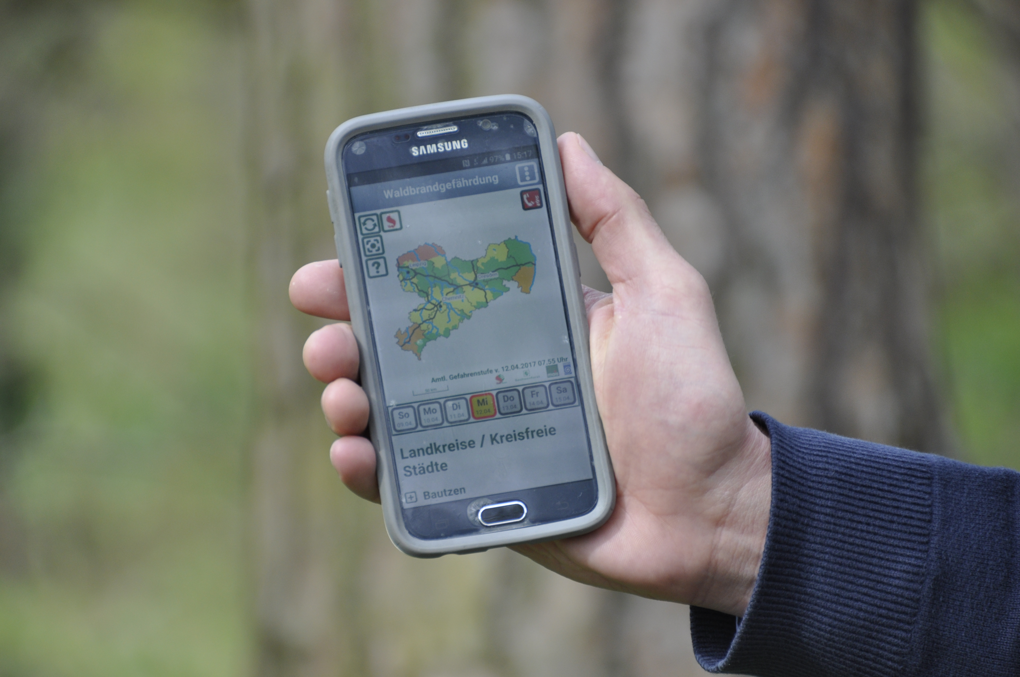 Alle Informationen zur aktuellen Waldbrandgefahr und dem richtigen Verhalten bietet schnell, unkompliziert und kostenlos die mobile App »Waldbrandgefahr Sachsen« von Sachsenforst. Über die integrierte Notruf- und Standort-Funktion kann jede und jeder einen aktiven Beitrag zum Waldbrandschutz und zur eigenen Sicherheit leisten. Dank der GPS-gestützten Standortermittlung sind die exakte Position des Brandortes und der nächstgelegene Rettungspunkt im Wald leicht zu ermitteln. Die Waldbrand-App ist in allen gut sortierten App-Stores kostenfrei erhältlich.