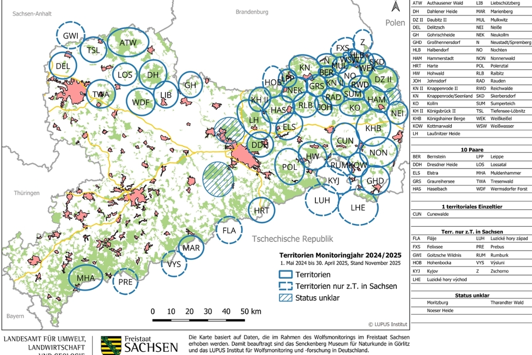 In Sachsen gibt es aktuell 35 Wolfsrudel, zehn Wolfspaare und einen territorialen Einzelwolf. Das sind die Ergebnisse der abgeschlossenen wissenschaftlichen Auswertung des Monitoringjahres 2024/2025, die das Sächsische Landesamt für Umwelt, Landwirtschaft und Geologie (LfULG) heute veröffentlicht hat.