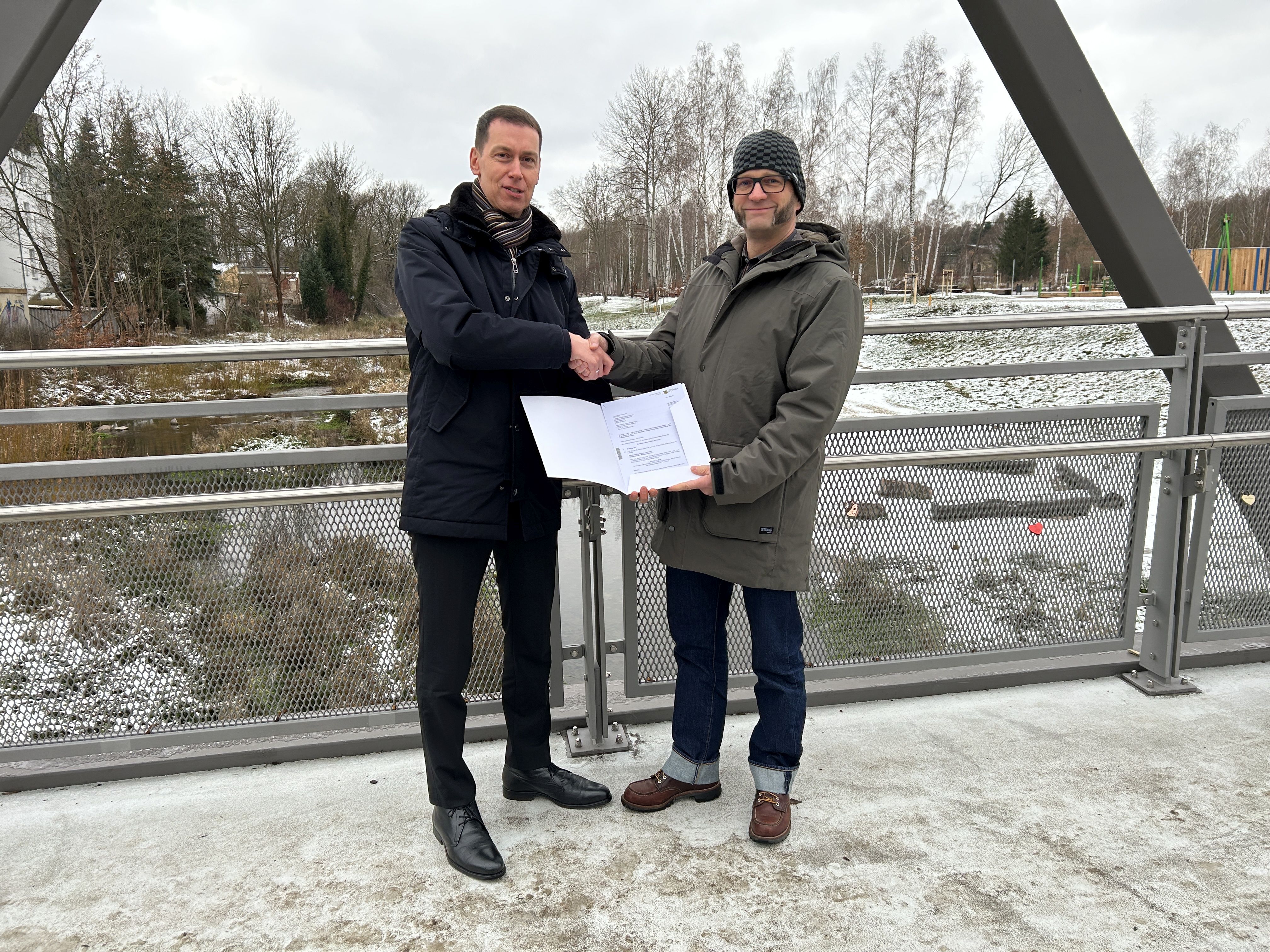 Die Landesdirektion Sachsen hat der Stadt Chemnitz für die weitere Renaturierung des Pleißenbachs im Stadtteil Altendorf rund 2,3 Millionen Euro bewilligt. Der Präsident der Landesdirektion Sachsen, Béla Bélafi, übergab heute (27.11.) den Fördermittelbescheid im Stadtteilpark am Pleißenbach an Bürgermeister Thomas Kütter. Die Gesamtkosten für den ökologischen Umbau des Bachabschnittes einschließlich der umfangreichen Entsorgung von Altlasten betragen rund 2,6 Millionen Euro. Den Differenzbetrag bringt die Stadt Chemnitz aus eigenen Haushaltsmitteln auf. Die Fördermittel stammen aus der Förderrichtlinie Gewässer/Hochwasserschutz des Freistaates Sachsen.