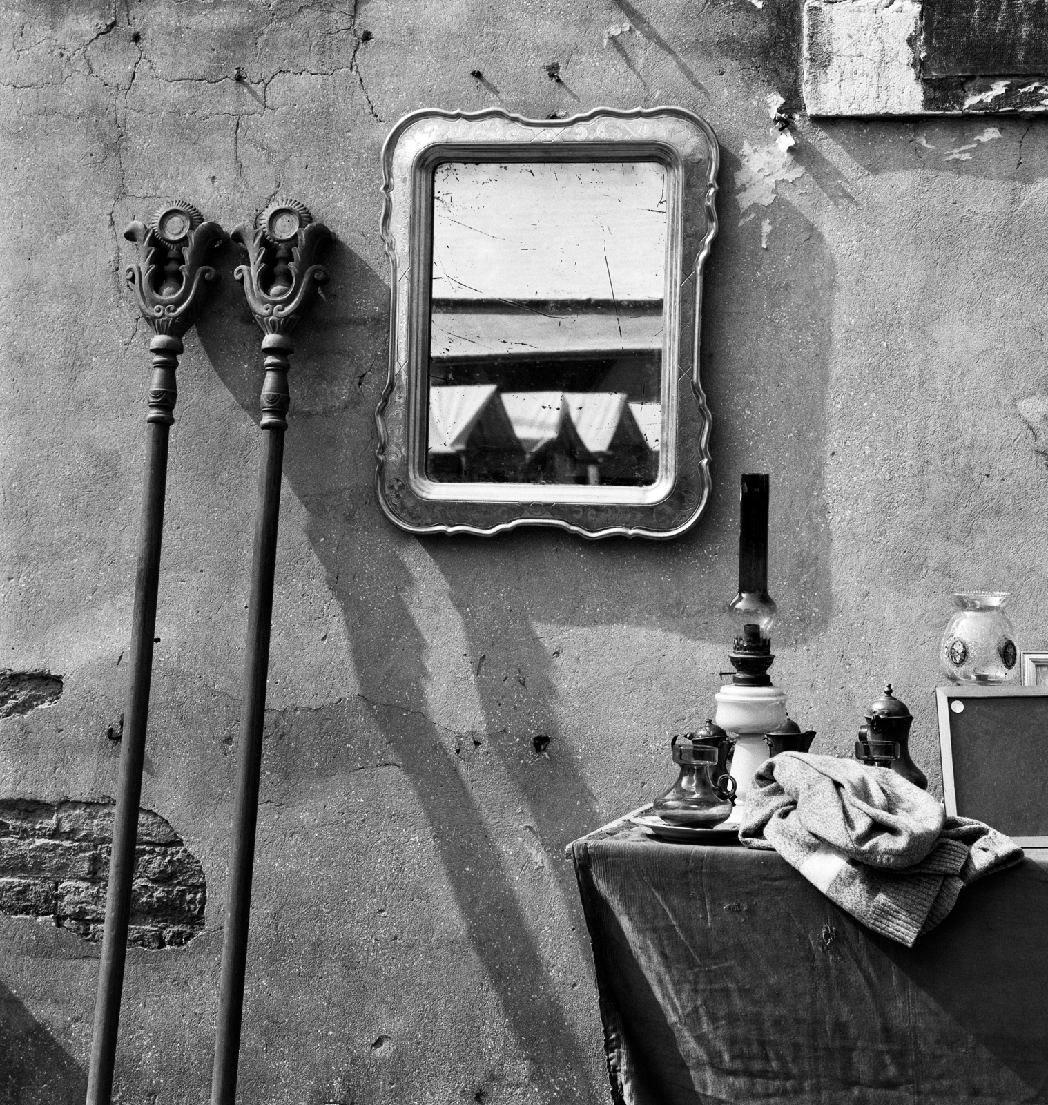 Auf ihren Streifzügen durch das Labyrinth der Gassen wirft sie beiläufige Blicke in Schaufenster, in Werkstätten und Ladenlokale, meist in fragmentierenden Ausschnitten. Ikonische Details wie die Fero da prora, die Metallblätter am Bug der Gondeln, taucht sie in Licht und Schatten. Assoziativ, fast traumwandlerisch sucht sie, Vergangenheit in der Gegenwart sichtbar zu machen. Ihre gleichsam zu urbanen Stillleben komprimierten Stadtansichten erschienen 1996 im Buch »Venedig – Stimmen zwischen Stein und Meer«, in dem auch Porträts von Venezianer:innen eine wesentliche Rolle spielen.