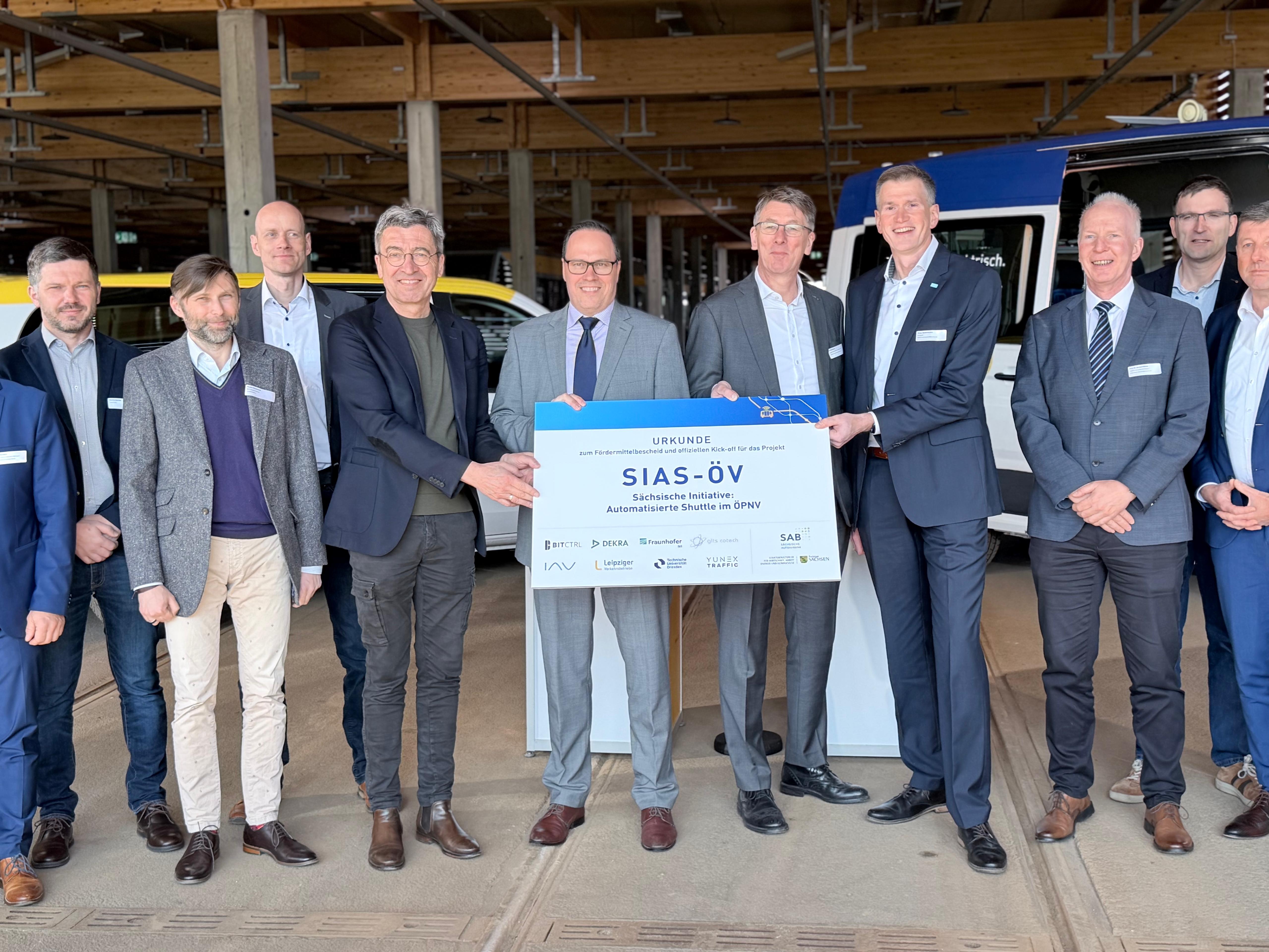 Die Leipziger Verkehrsbetriebe (LVB) GmbH setzen gemeinsam mit Partnern aus Wirtschaft und Wissenschaft die Entwicklung autonomer Mobilitätssysteme für den öffentlichen Personennahverkehr konsequent fort. Mit der »Sächsischen Initiative Automatisierte Shuttle im ÖPNV – SIAS-ÖV« startet nun ein Forschungs- und Entwicklungsprojekt, das den Weg für fahrerlose Shuttlebusse industrieller Hersteller im öffentlichen Verkehr ebnen soll. Die Europäische Kommission und der Freistaat Sachsen stellen Fördermittel in Höhe von rund 9,5 Millionen Euro als Zuwendung im Rahmen der sächsischen EFRE-Technologieförderung 2021-2027 bereit. Heute übergab der Sächsische Staatsminister für Wirtschaft, Arbeit, Energie und Klimaschutz, Dirk Panter, die Fördermittelbescheide in Leipzig.