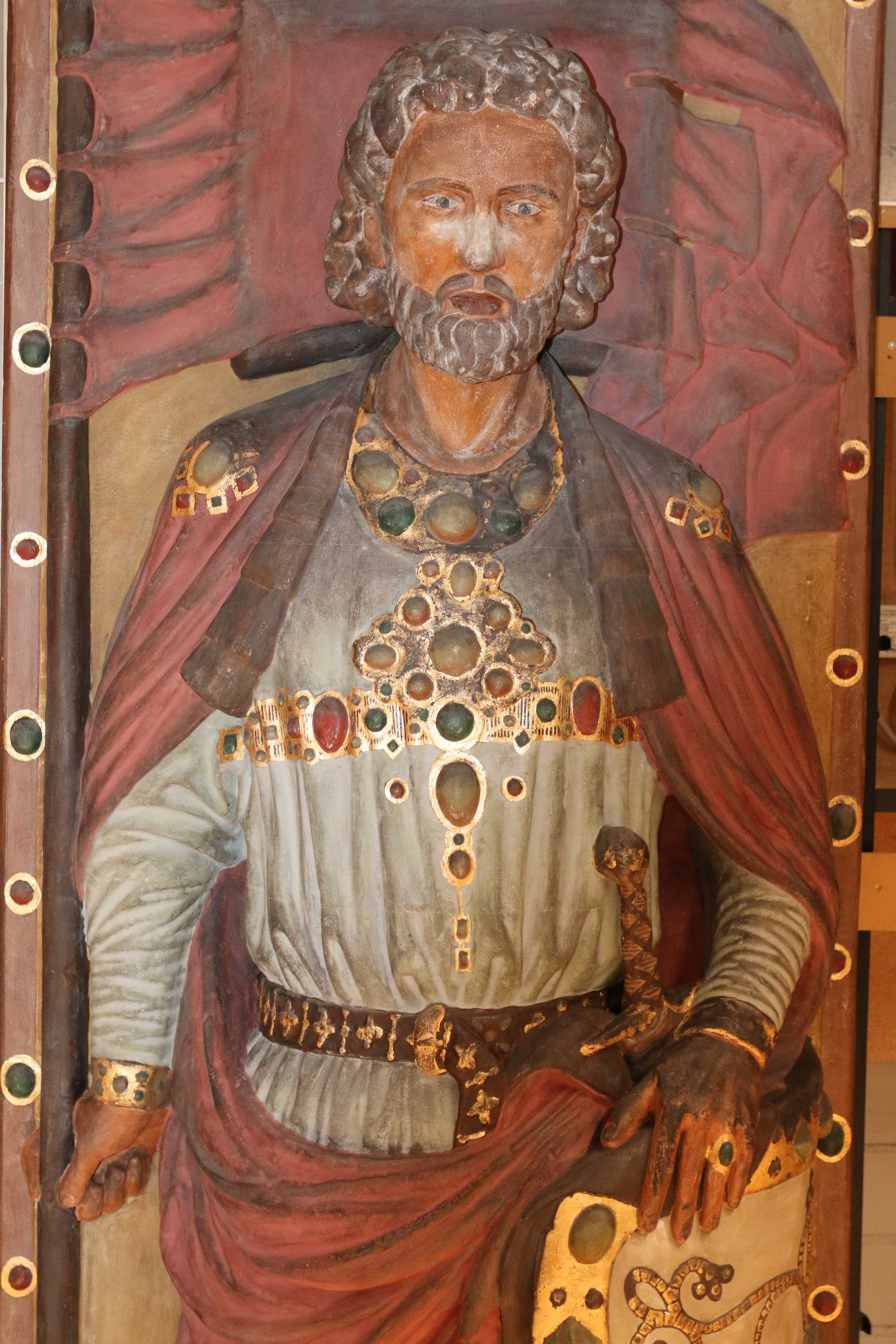 Am heutigen Freitag, 4.4.2014, montiert das smac die 400 Kilogramm schwere Replik der Grabplatte Wiprechts von Groitzsch (1050 – 1124) in der Dauerausstellung. Die aufwändig gestaltete, farbige Tumba-Deckplatte stellt den Adligen idealtypisch und im kostbaren edelsteinbesetzten Gewand dar. Das spätromanische Meisterwerk ist eines der bedeutendsten Zeugnisse der obersächsischen Bildhauerkunst.