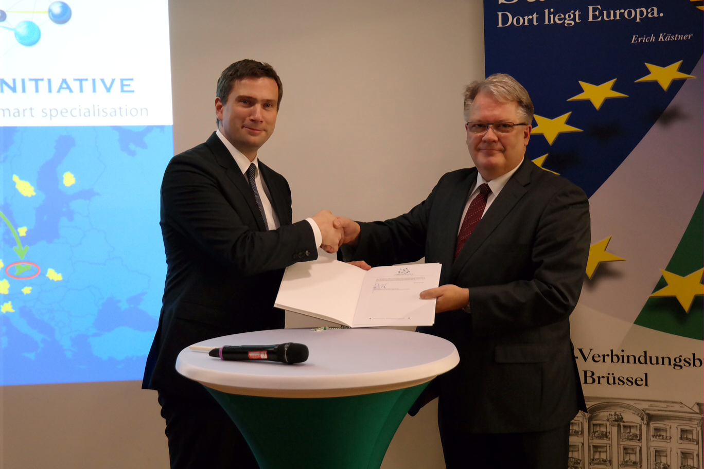 Im Rahmen der Abendveranstaltung unterzeichnete Wirtschaftsminister Dulig auch die Beitrittserklärung des Freistaates zur Vanguard-Initiative. Vanguard ist eine von mehreren Regionen initiierte Fachinitiative auf dem Gebiet moderner Fertigungstechnologien. Gemeinsam wollen sich die Regionen in Brüssel für eine besser verzahnte europäische Innovationspolitik einsetzen. Sachsen wird zukünftig in enger Zusammenarbeit mit anderen Regionen Projektvorschläge auf dem Gebiet fortgeschrittener Produktionstechnologien entwickeln und der Europäischen Kommission zur Förderung vorschlagen. Ziel ist die Realisierung länderübergreifender Pilotlinien unter maßgeblicher Mitwirkung sächsischer Unternehmen und Forschungseinrichtungen. Auch Vertreter der TU Chemnitz und des Fraunhofer-Instituts für Werkzeugmaschinen und Umformtechnik IWU arbeiten derzeit in den Vanguard-Projekt-Arbeitsgruppen mit.