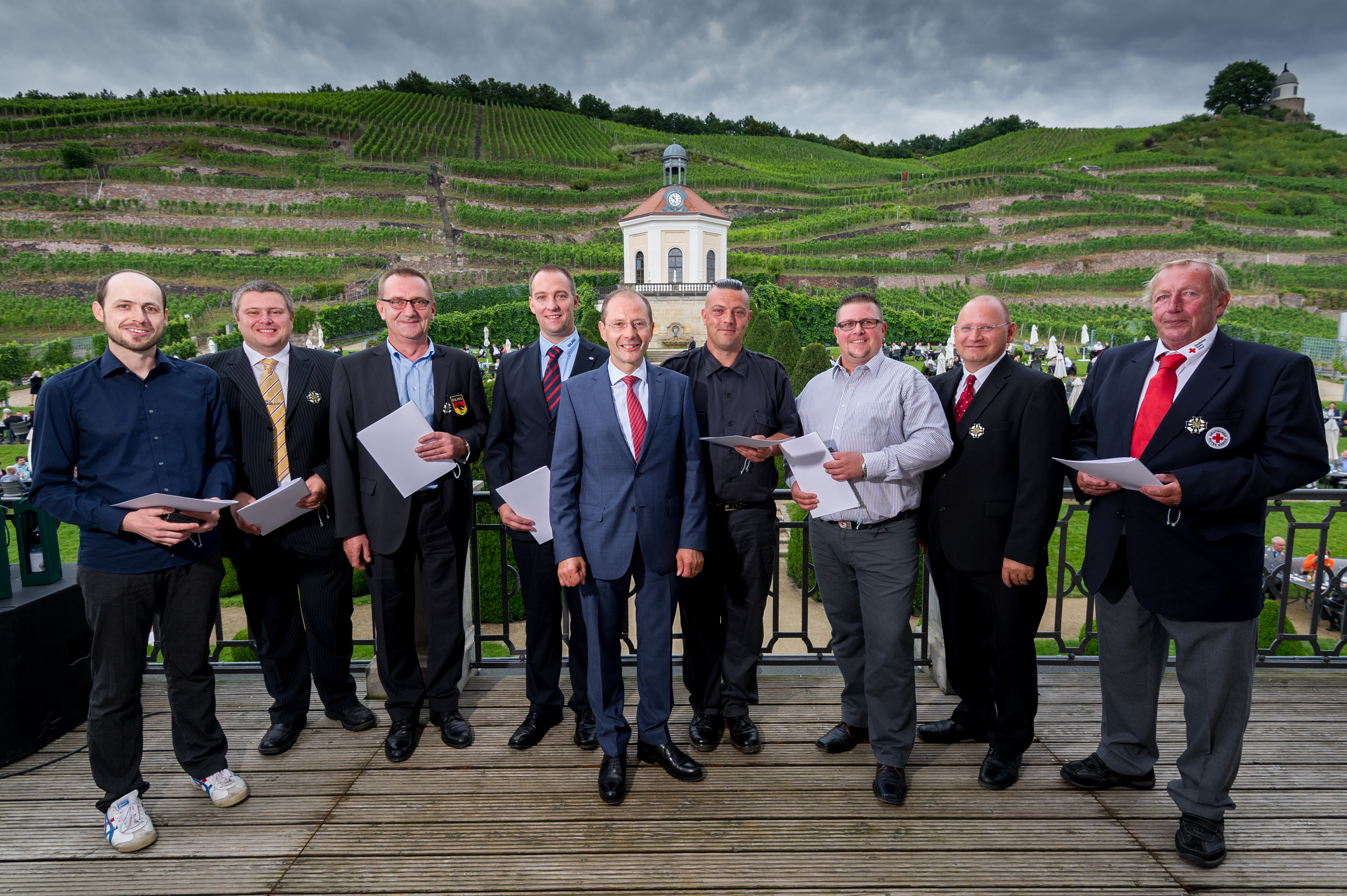 Sachsens Innenminister Markus Ulbig hat heute auf Schloss Wackerbarth in Radebeul insgesamt 370 ehrenamtliche Helfer aus ganz Sachsen empfangen und sich für ihre aufopferungsvolle Arbeit bedankt. Im Rahmen der Veranstaltung hat der Minister acht Helfern das Sächsische Helferehrenzeichen als Steckkreuz in Silber überreicht. Diese Auszeichnung würdigt langjähriges und herausragendes Engagement im Rettungsdienst oder Katastrophenschutz.