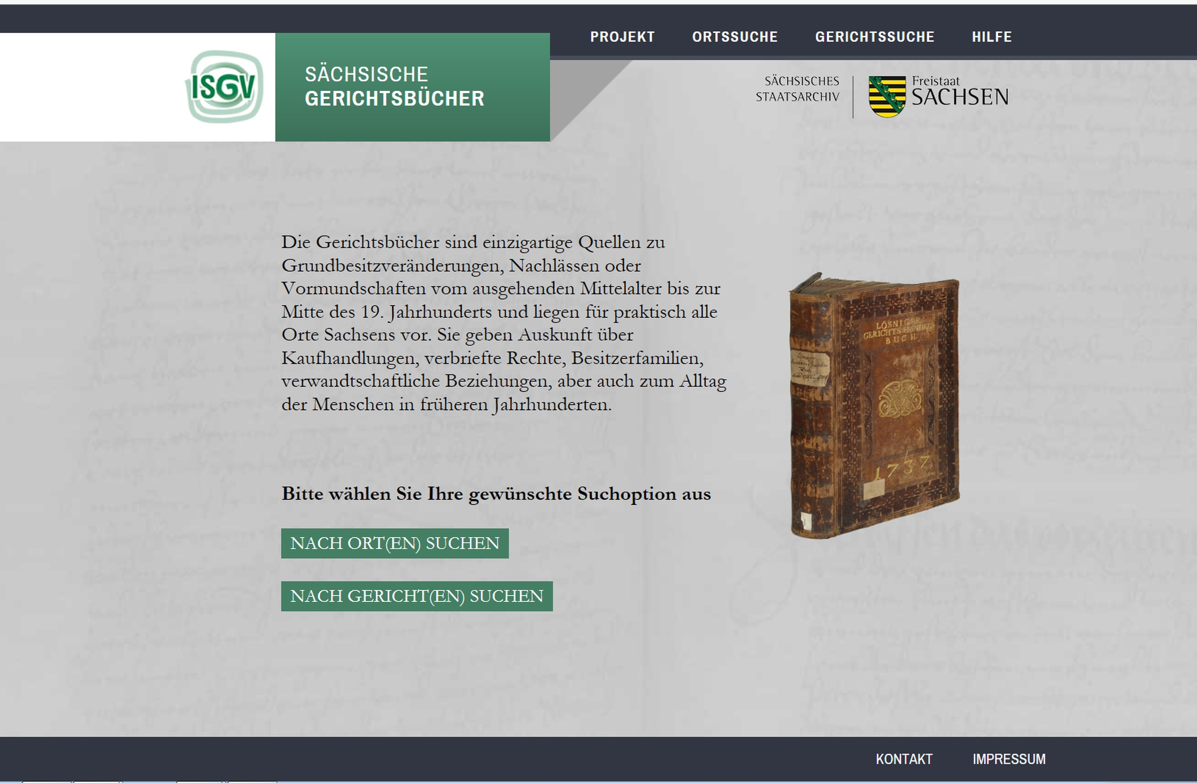 Gerichtsbücher gehören zu den am häufigsten genutzten Quellen im Sächsischen Staatsarchiv. Sie sind flächendeckend für Sachsen vom Ende des 15. Jh. bis um 1856 überliefert und besitzen urkundlichen Charakter. Neben den 22.900 Bänden im Staatsarchiv konnten nennenswerte Bestände von Gerichtsbüchern in neun sächsischen Stadtarchiven (Bautzen, Dresden, Görlitz, Kamenz, Leipzig, Löbau, Meißen, Plauen, Zwickau) und dem Staatsfilialarchiv Bautzen in das Projekt einbezogen werden. Die Erschließungsinformationen werden für die Benutzer künftig online auf der neuen Website „Sächsische Gerichtsbücher“ recherchierbar sein. Diese wurde in Kooperation mit dem Institut für Sächsische Geschichte und Volkskunde e. V. (ISGV) entwickelt und mit anderen Projekten wie dem "Digitalen Historische Ortsverzeichnis von Sachsen" verknüpft.