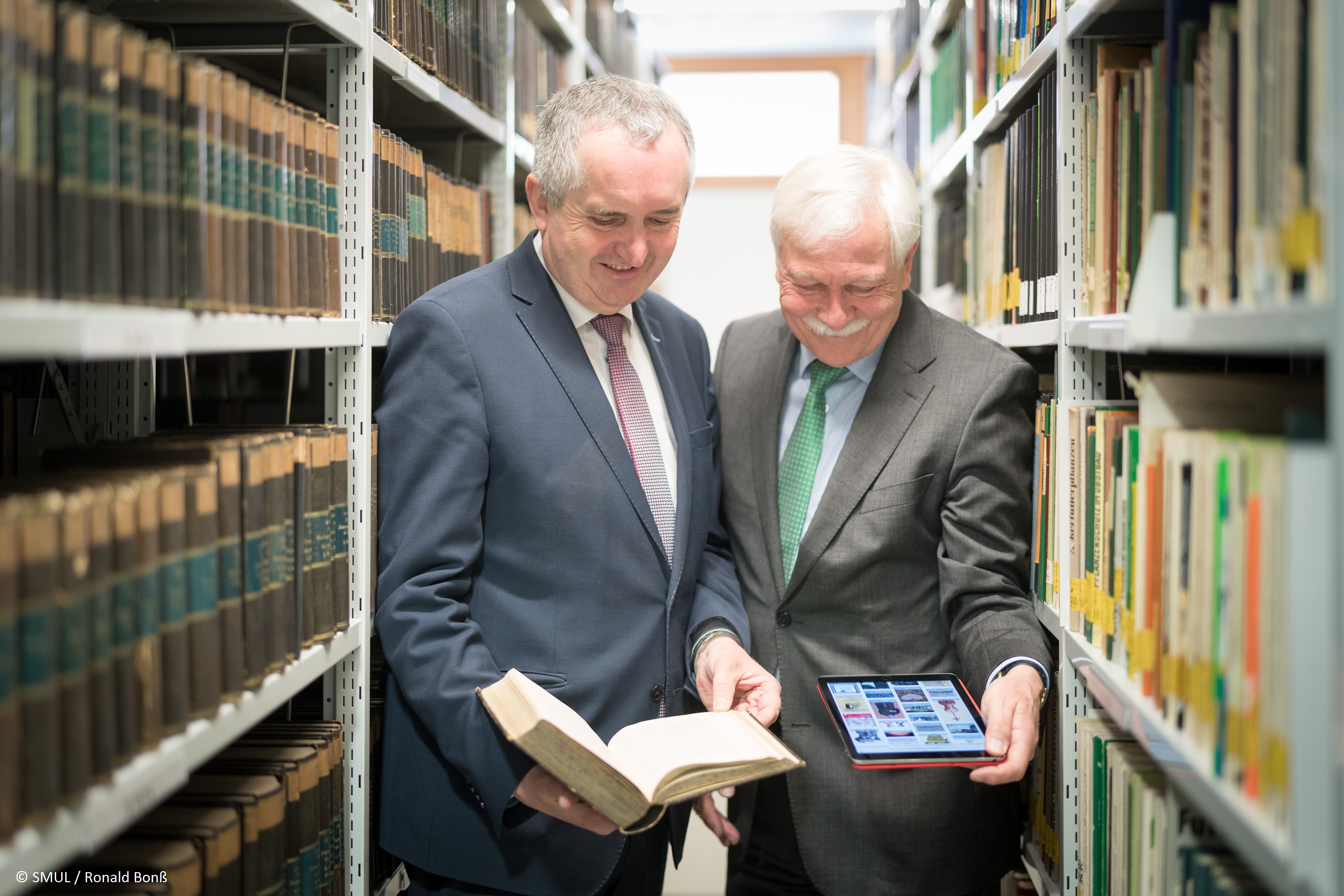 Im Rahmen seines Besuches informierte sich der Staatsminister zudem über den Mehrwert und die Nachhaltigkeit der Digitalisierung für Kultur, Wissenschaft und eine breite Öffentlichkeit. Der Generaldirektor der SLUB, Prof. Dr. Thomas Bürger, erläuterte während des Besuches das Landesdigitalisierungsprogramm, bei dem die SLUB eine wichtige Koordinierungs- und Dienstleistungsfunktion für die Bibliotheken im Freistaat Sachsen übernimmt. „Qualität, freier Zugang und Nachhaltigkeit von Information und Wissen sind das Fundament gesellschaftlichen Zusammenhalts“, so Prof. Bürger.