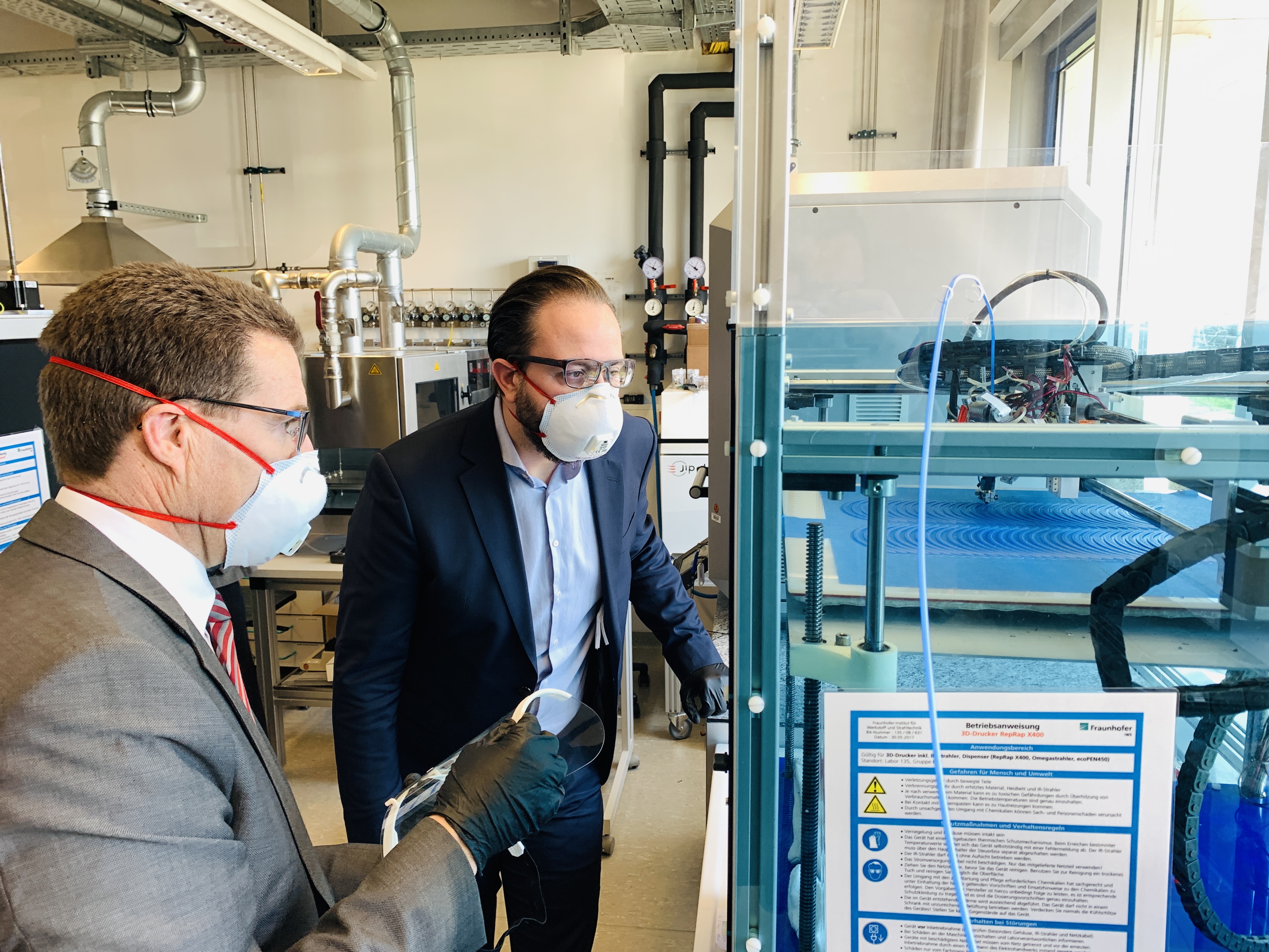 Wissenschaftsminister Sebastian Gemkow besuchte heute das Fraunhofer IWS: »Wo sonst Bauteile für Experimente oder neuartige Materialien gedruckt werden, stehen nun Entwicklungen für dringend notwendige Medizinprodukte im Fokus. Ich danke allen Engagierten, am Fraunhofer IWS, aber auch in den anderen Forschungseinrichtungen, die im Verbund DRESDEN-concept zusammenarbeiten und ganz schnell mit eigenen Maßnahmen auf die Bewältigung der Krise reagiert haben.«