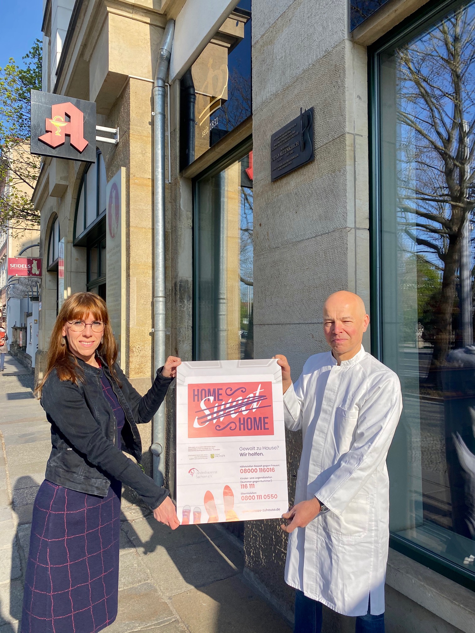 Das Sächsische Staatsministerium der Justiz und für Demokratie, Europa und Gleichstellung hat in Zusammenarbeit mit dem Landesfrauenrat Sachsen e.V. aus diesem Grund eine Plakatkampagne entwickelt, um auf die Hilfe-Telefonnummern besonders aufmerksam zu machen. Doch wo erreichen wir Menschen, die Hilfe suchen in der aktuellen Zeit, wo nahezu alles gesellschaftliche Leben auf ein Minimum beschränkt ist? Wir erreichen sie in Supermärkten, Apotheken und Banken.