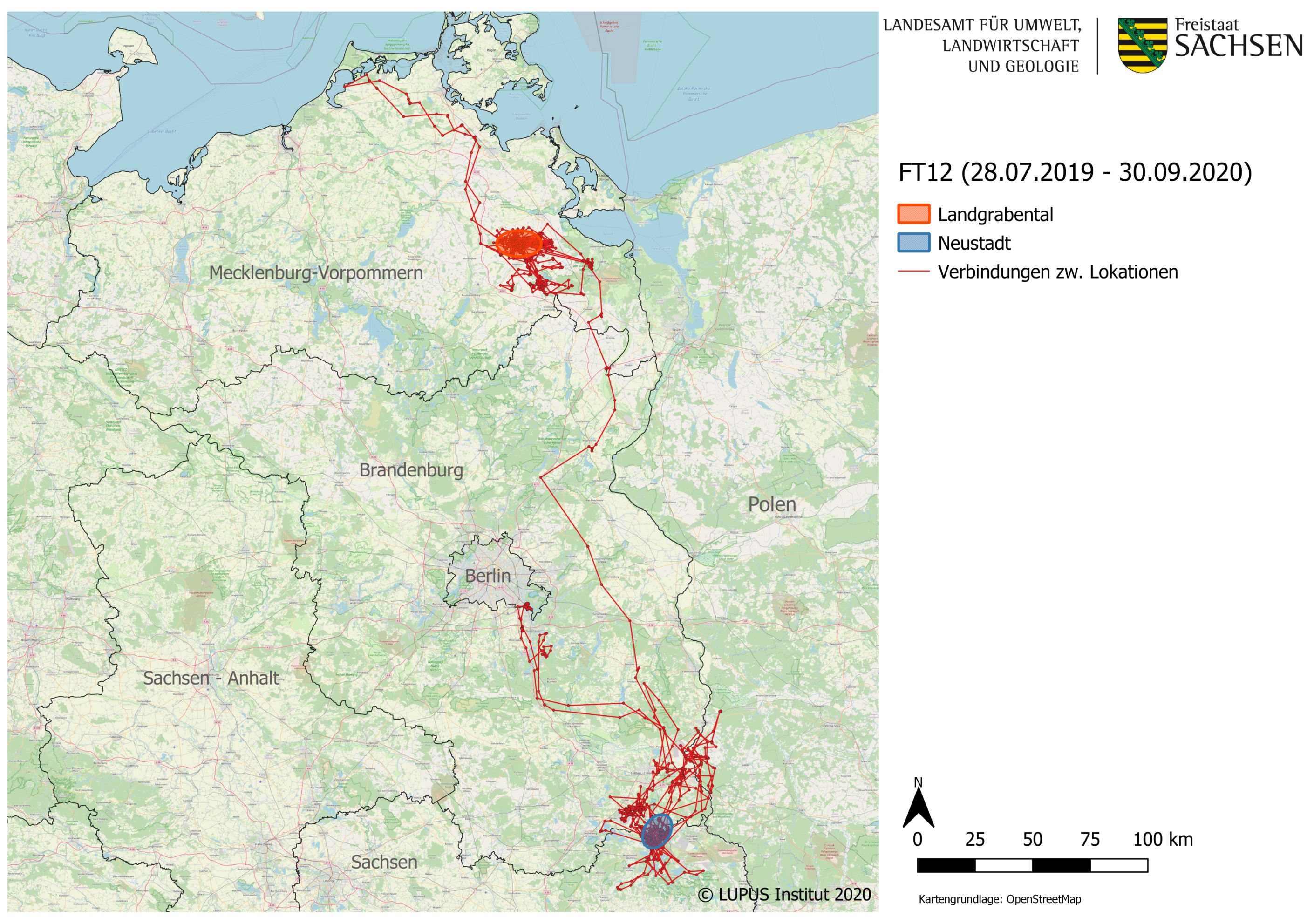 Im aktuell laufenden Monitoringjahr 2020/2021 konnte bisher in 17 Rudeln eine Reproduktion nachgewiesen werden. Auch zu den beiden mit einem Senderhalsband ausgestatteten sächsischen Wölfen gibt es neue Daten: Die Wölfin »Juli« (FT12) hatte Sachsen bereits im März Richtung Mecklenburg-Vorpommern verlassen. Seither hält sie sich im Landgrabental zwischen Anklam und Friedland auf und ist offensichtlich dort sesshaft geworden. Der seit April 2020 mit einem Senderhalsband ausgestattete Rüde »Peter« (MT8) ist der Vaterwolf des Mulkwitzer Rudels. Er bewegt sich als territorialer Wolf am Rand des Truppenübungsplatzes Oberlausitz auf einer Fläche von rund 60 Quadratkilometern. Über Aufnahmen aus Fotofallen konnten im Mulkwitzer Rudel bisher drei Welpen bestätigt werden.